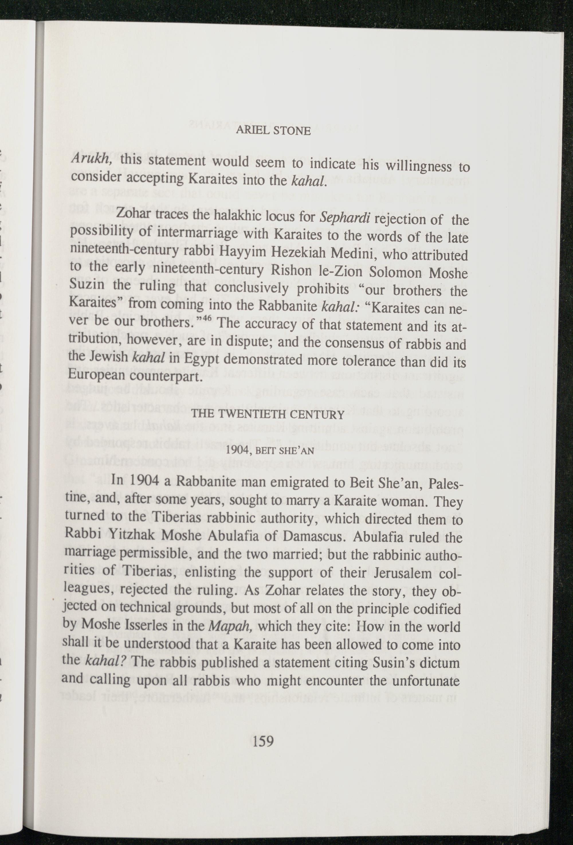 In 1904 a Rabbanite man emigrated to Beit Shean , Pales­tine, and, after some years, sought to marry a Karaite woman. They turned to the Tiberias rabbinic authority, which directed them to Rabbi Yitzhak Moshe Abulafia of Damascus . Abulafia ruled the marriage permissible, and the two married; but the rabbinic autho­rities of Tiberias, enlisting the support of their Jerusalem col­leagues, rejected the ruling. As Zohar relates the story, they ob­~ jected on technical grounds, but most of all on the principle codified by Moshe Isserles in the Mapah, which they cite: How in the world shall it be understood that a Karaite has been allowed to come into the kahal? The rabbis published a statement citing Susins dictum and calling upon all rabbis who might encounter the unfortunate