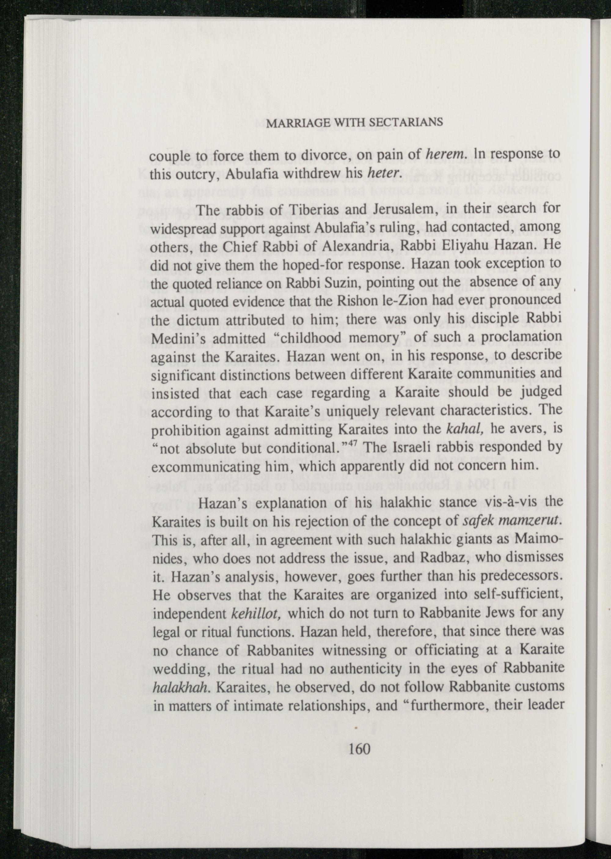 Hazan’s explanation of his halakhic stance vis-a-vis the Karaites is built on his rejection of the concept of safek mamzerut. This is, after all, in agreement with such halakhic giants as Maimo nides , who does not address the issue, and Radbaz , who dismisses it. Hazan’s analysis, however, goes further than his predecessors. He observes that the Karaites are organized into self-sufficient, independent kehillot, which do not turn to Rabbanite Jews for any legal or ritual functions. Hazan held, therefore, that since there was no chance of Rabbanites witnessing or officiating at a Karaite wedding, the ritual had no authenticity in the eyes of Rabbanite halakhah. Karaites , he observed, do not follow Rabbanite customs in matters of intimate relationships, and“furthermore, their leader