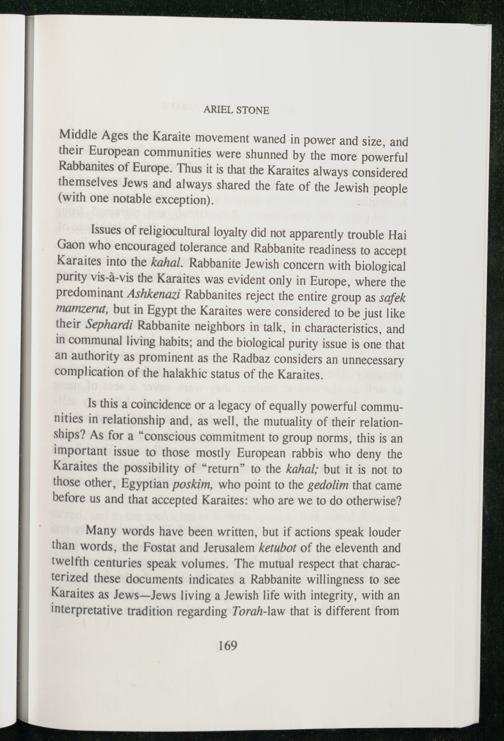 Many words have been written, but if actions speak louder than words, the Fostat and Jerusalem ketubot of the eleventh and twelfth centuries speak volumes. The mutual respect that characterized these documents indicates a Rabbanite willingness to see Karaites as Jews —Jews living a Jewish life with integrity, with an interpretative tradition regarding Torah-law that is different from