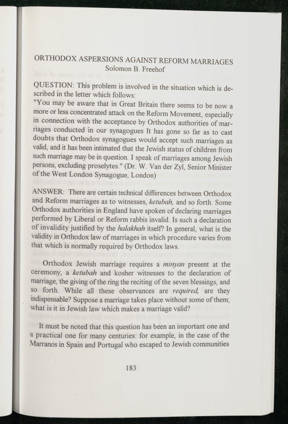"You may be aware that in Great Britain there seems to be now a more or less concentrated attack on the Reform Movement, especially in connection with the acceptance by Orthodox authorities of marriages conducted in our synagogues It has gone so far as to cast doubts that Orthodox synagogues would accept such marriages as valid, and it has been intimated that the Jewish status of children from such marriage may be in question. I speak of marriages among Jewish persons, excluding proselytes."(Dr. W. Van der Zyl, Senior Minister of the West London Synagogue, London )