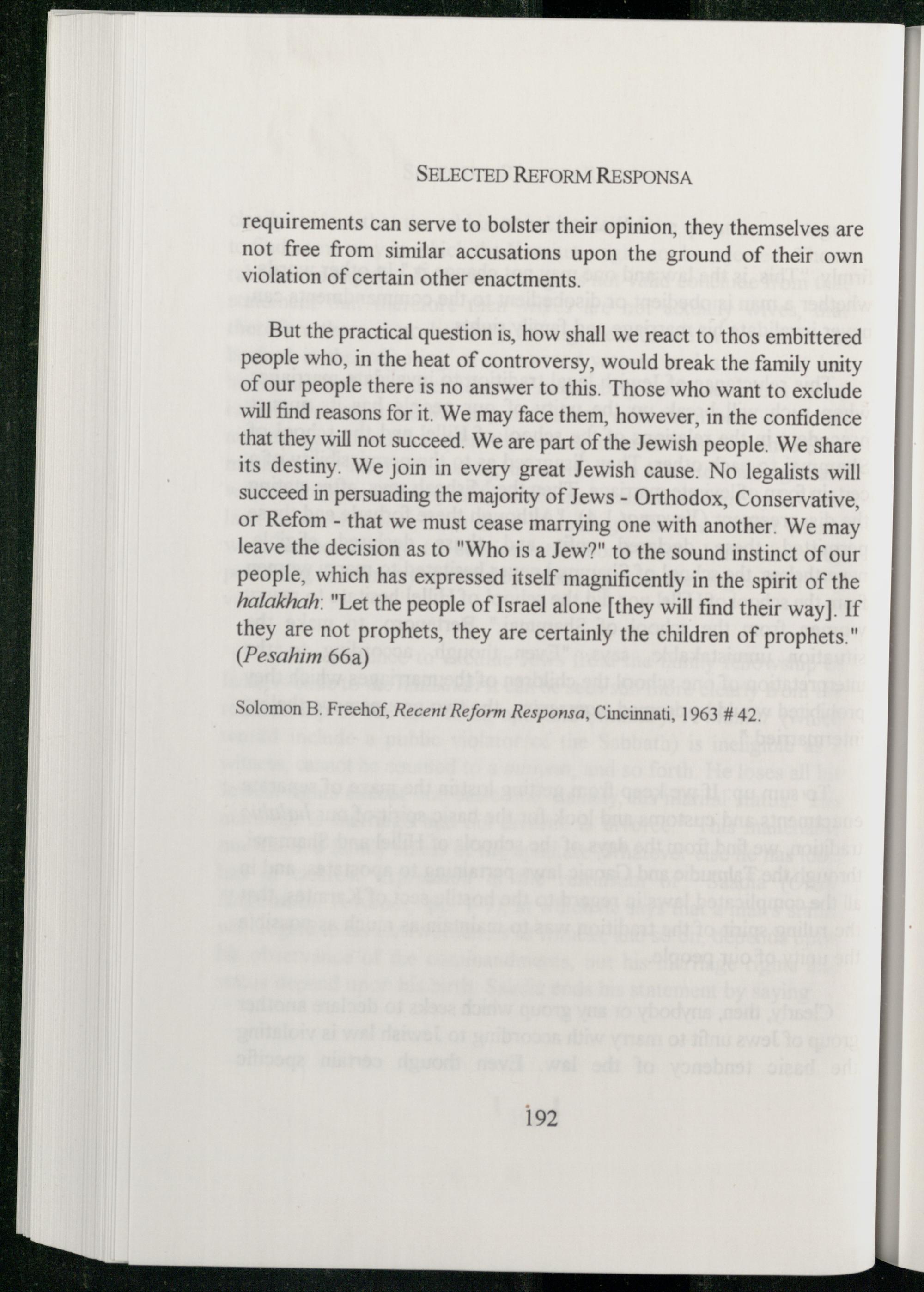 But the practical question is, how shall we react to thos embittered people who, in the heat of controversy, would break the family unity of our people there is no answer to this. Those who want to exclude will find reasons for it. We may face them, however, in the confidence that they will not succeed. We are part of the Jewish people. We share its destiny. We join in every great Jewish cause. No legalists will succeed in persuading the majority of Jews - Orthodox, Conservative, or Refom- that we must cease marrying one with another. We may leave the decision as to"Who is a Jew?" to the sound instinct of our people, which has expressed itself magnificently in the spirit of the halakhah:"Let the people of Israel alone[they will find their way]. If they are not prophets, they are certainly the children of prophets." (Pesahim 66a)