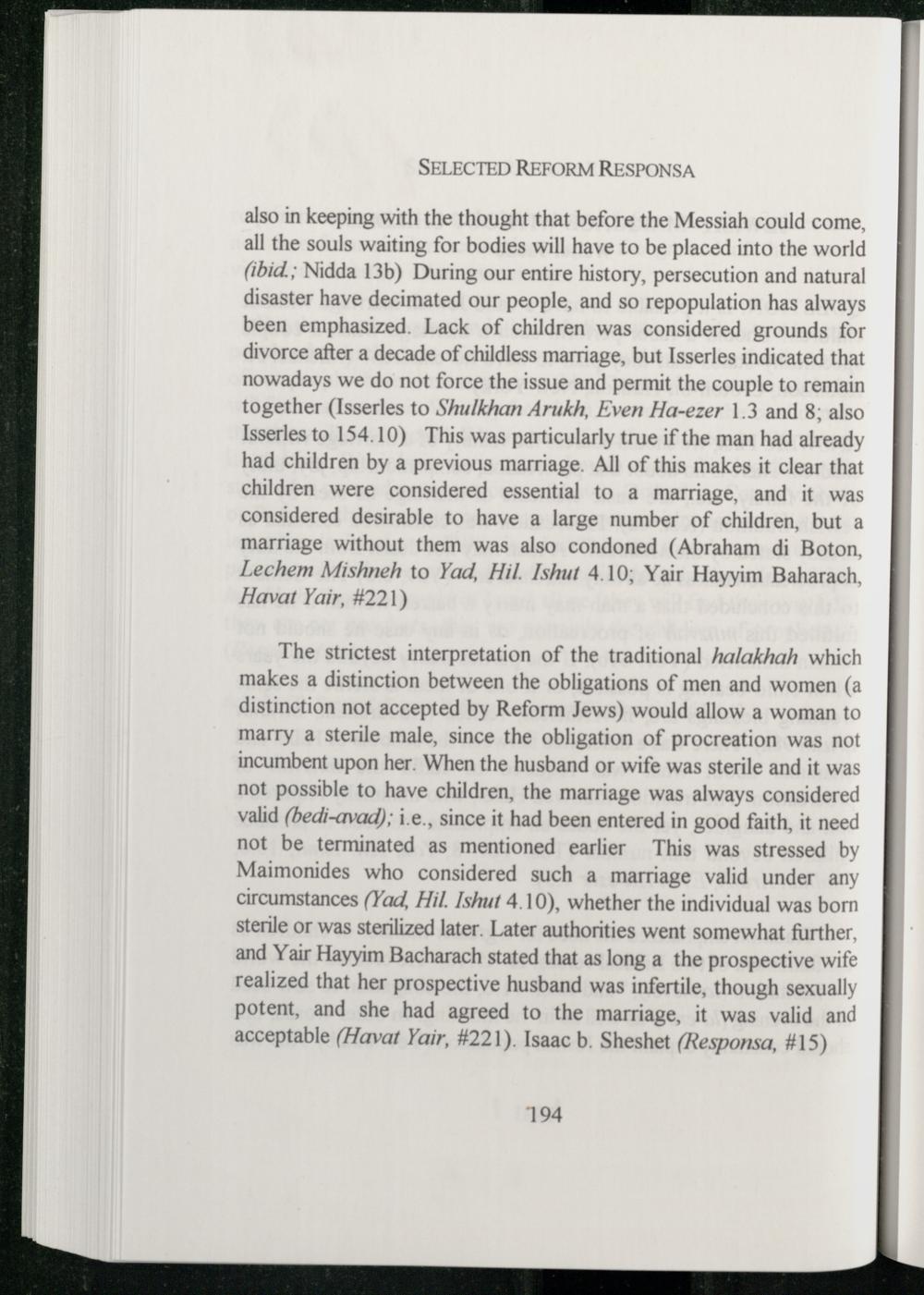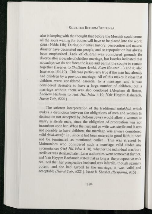 The strictest interpretation of the traditional halakhah which makes a distinction between the obligations of men and women(a distinction not accepted by Reform Jews) would allow a woman to marry a sterile male, since the obligation of procreation was not incumbent upon her. When the husband or wife was sterile and it was not possible to have children, the marriage was always considered valid(bedi-avad); i.e., since it had been entered in good faith, it need not be terminated as mentioned earlier This was stressed by Maimonides who considered such a marriage valid under any circumstances(Yad Hil. Ishut 4. 10), whether the individual was born sterile or was sterilized later. Later authorities went somewhat further, and Yair Hayyim Bacharach stated that as long a the prospective wife realized that her prospective husband was infertile, though sexually potent, and she had agreed to the marriage, it was valid and acceptable(Havat Yair,#221). Isaac b. Sheshet(Responsa,#15)