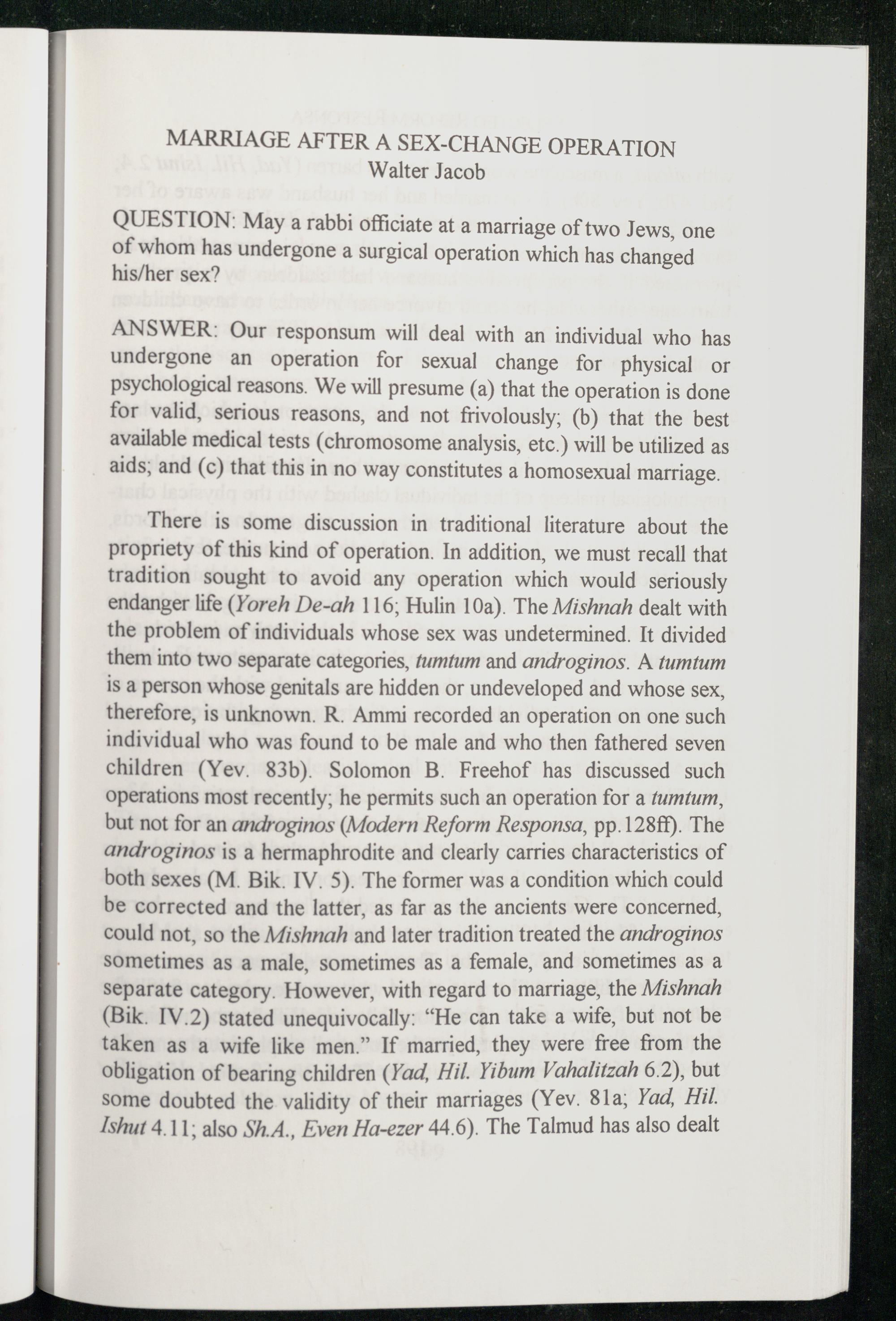 There is some discussion in traditional literature about the propriety of this kind of operation. In addition, we must recall that tradition sought to avoid any operation which would seriously endanger life(Yoreh De-ah 116; Hulin 10a). The Mishnah dealt with the problem of individuals whose sex was undetermined. It divided them into two separate categories, fumtum and androginos. A tumtum is a person whose genitals are hidden or undeveloped and whose sex, therefore, is unknown. R. Ammi recorded an operation on one such individual who was found to be male and who then fathered seven children(Yev. 83b). Solomon B. Freehof has discussed such operations most recently; he permits such an operation for a tumtum, but not for an androginos(Modern Reform Responsa, pp.128ff). The androginos is a hermaphrodite and clearly carries characteristics of both sexes(M. Bik. IV. 5). The former was a condition which could be corrected and the latter, as far as the ancients were concerned, could not, so the Mishnah and later tradition treated the androginos sometimes as a male, sometimes as a female, and sometimes as a separate category. However, with regard to marriage, the Mishnah (Bik. IV.2) stated unequivocally:“He can take a wife, but not be taken as a wife like men.” If married, they were free from the obligation of bearing children(Yad, Hil. Yibum Vahalitzah 6.2), but some doubted the validity of their marriages(Yev. 81a; Yad, Hil. Ishut 4.11; also Sh.A., Even Ha-ezer 44.6). The Talmud has also dealt