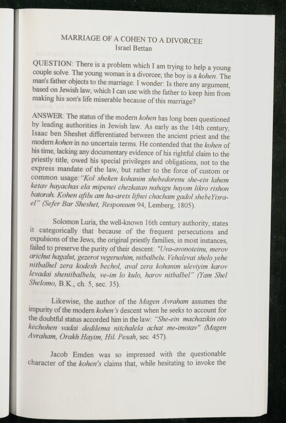 MARRIAGE OF A COHEN TO A DIVORCEE Israel Bettan