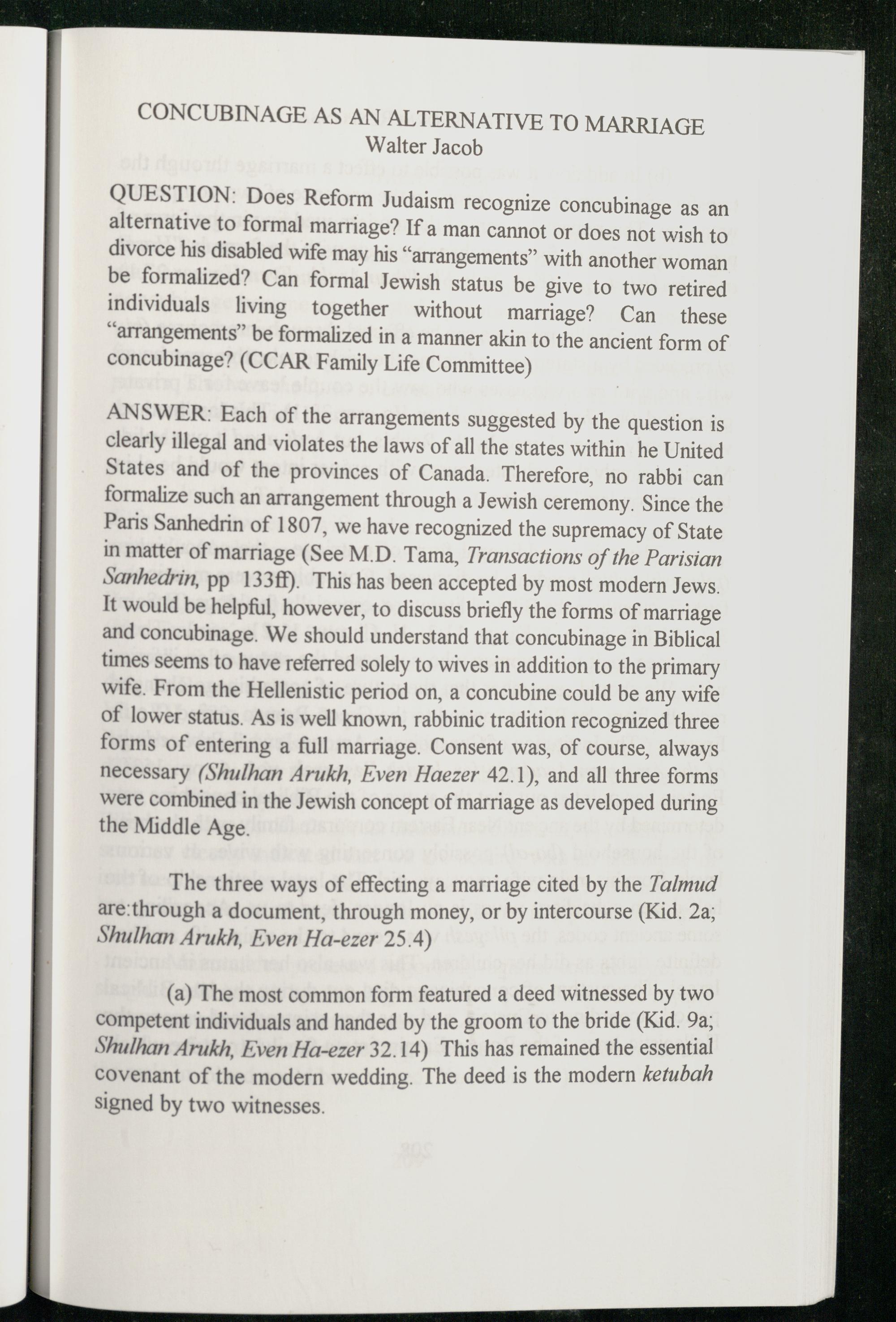 QUESTION: Does Reform Judaism recognize concubinage as an alternative to formal marriage? If a man cannot or does not wish to divorce his disabled wife may his“arrangements” with another woman be formalized? Can formal Jewish status be give to two retired individuals living together without marriage? Can these “arrangements” be formalized in a manner akin to the ancient form of concubinage?(CCAR Family Life Committee)