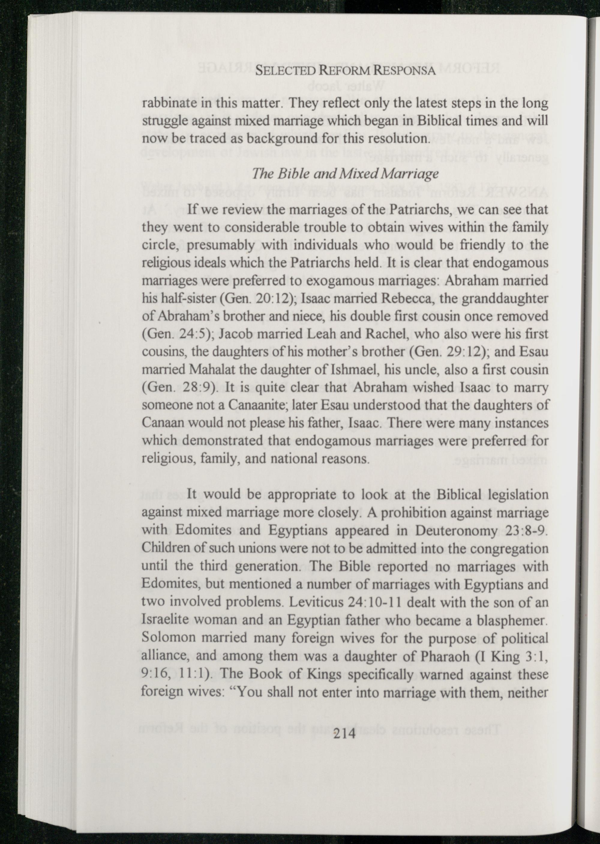 It would be appropriate to look at the Biblical legislation against mixed marriage more closely. A prohibition against marriage with Edomites and Egyptians appeared in Deuteronomy 23:8-9. Children of such unions were not to be admitted into the congregation until the third generation. The Bible reported no marriages with Edomites , but mentioned a number of marriages with Egyptians and two involved problems. Leviticus 24:10-11 dealt with the son of an Israelite woman and an Egyptian father who became a blasphemer. Solomon married many foreign wives for the purpose of political alliance, and among them was a daughter of Pharaoh (I King 3:1, 9:16, 11:1). The Book of Kings specifically warned against these foreign wives:“You shall not enter into marriage with them, neither