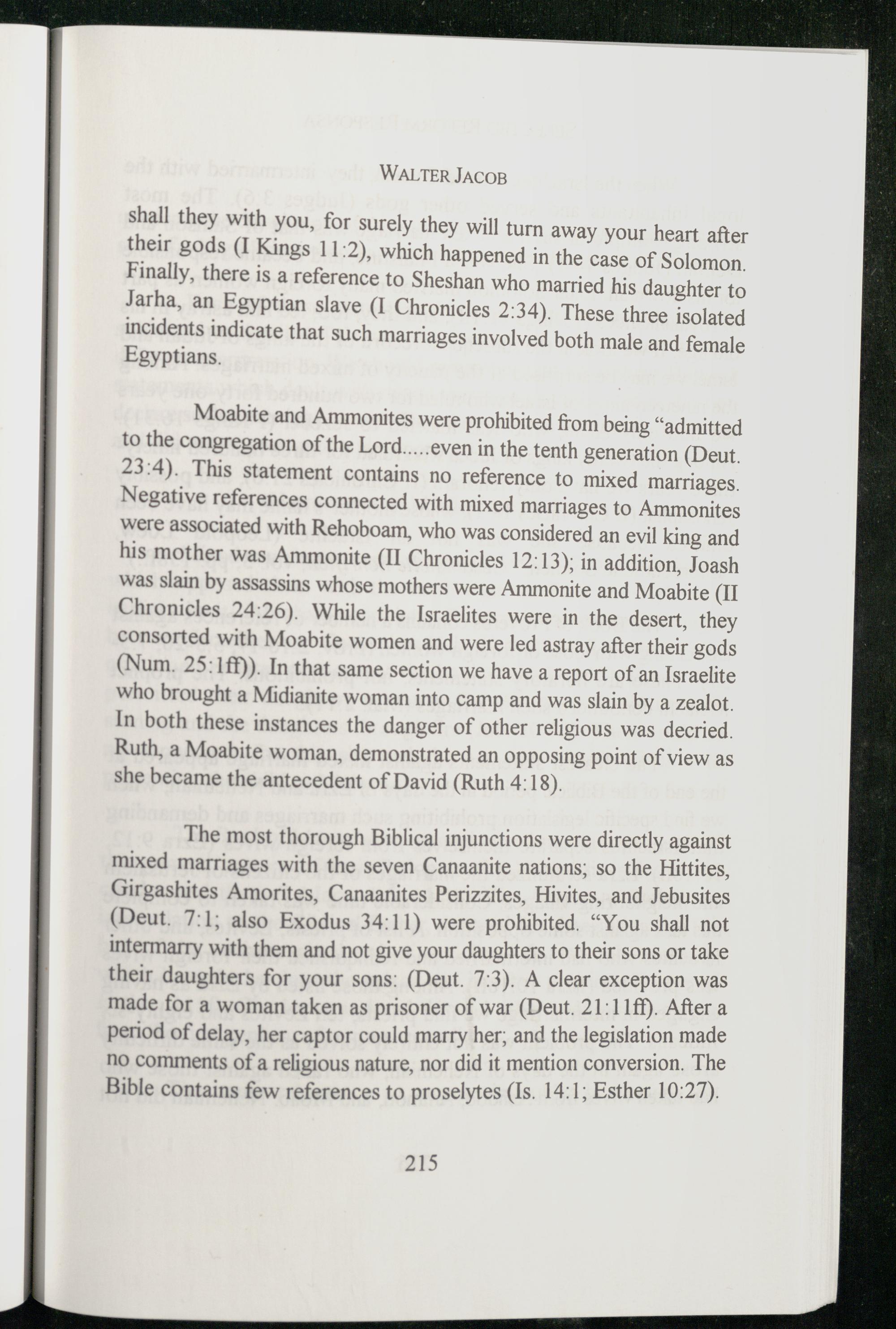 The most thorough Biblical injunctions were directly against mixed marriages with the seven Canaanite nations; so the Hittites , Girgashites Amorites, Canaanites Perizzites, Hivites, and Jebusites (Deut. 7:1; also Exodus 34:11) were prohibited.“You shall not intermarry with them and not give your daughters to their sons or take their daughters for your sons:(Deut. 7:3). A clear exception was made for a woman taken as prisoner of war(Deut. 211140). After a period of delay, her captor could marry her; and the legislation made No comments of a religious nature, nor did it mention conversion. The Bible contains few references to proselytes(Is. 14:1; Esther 10:27).