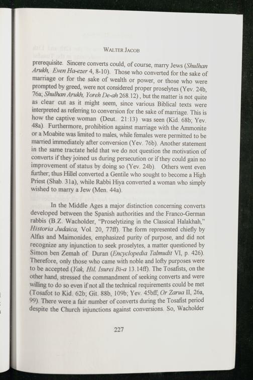 In the Middle Ages a major distinction concerning converts developed between the Spanish authorities and the Franco-German rabbis(B.Z. Wacholder,“Proselytizing in the Classical Halakhah,” Historia Judaica, Vol. 20, 77ff). The form represented chiefly by Alfas and Maimonides , emphasized purity of purpose, and did not recognize any injunction to seek proselytes, a matter questioned by Simon ben Zemah of Duran(Encyclopedia Talmudit V1, p. 426). Therefore, only those who came with noble and lofty purposes were to be accepted(Yak, Hil. Isurei Bi-a 13.14ff). The Tosafists, on the other hand, stressed the commandment of seeking converts and were willing to do so even if not all the technical requirements could be met (Tosafot to Kid. 62b; Git . 88b, 109b; Yev. 45bff; Or Zarua 11, 26a, 99). There were a fair number of converts during the Tosafist period despite the Church injunctions against conversions. So, Wacholder