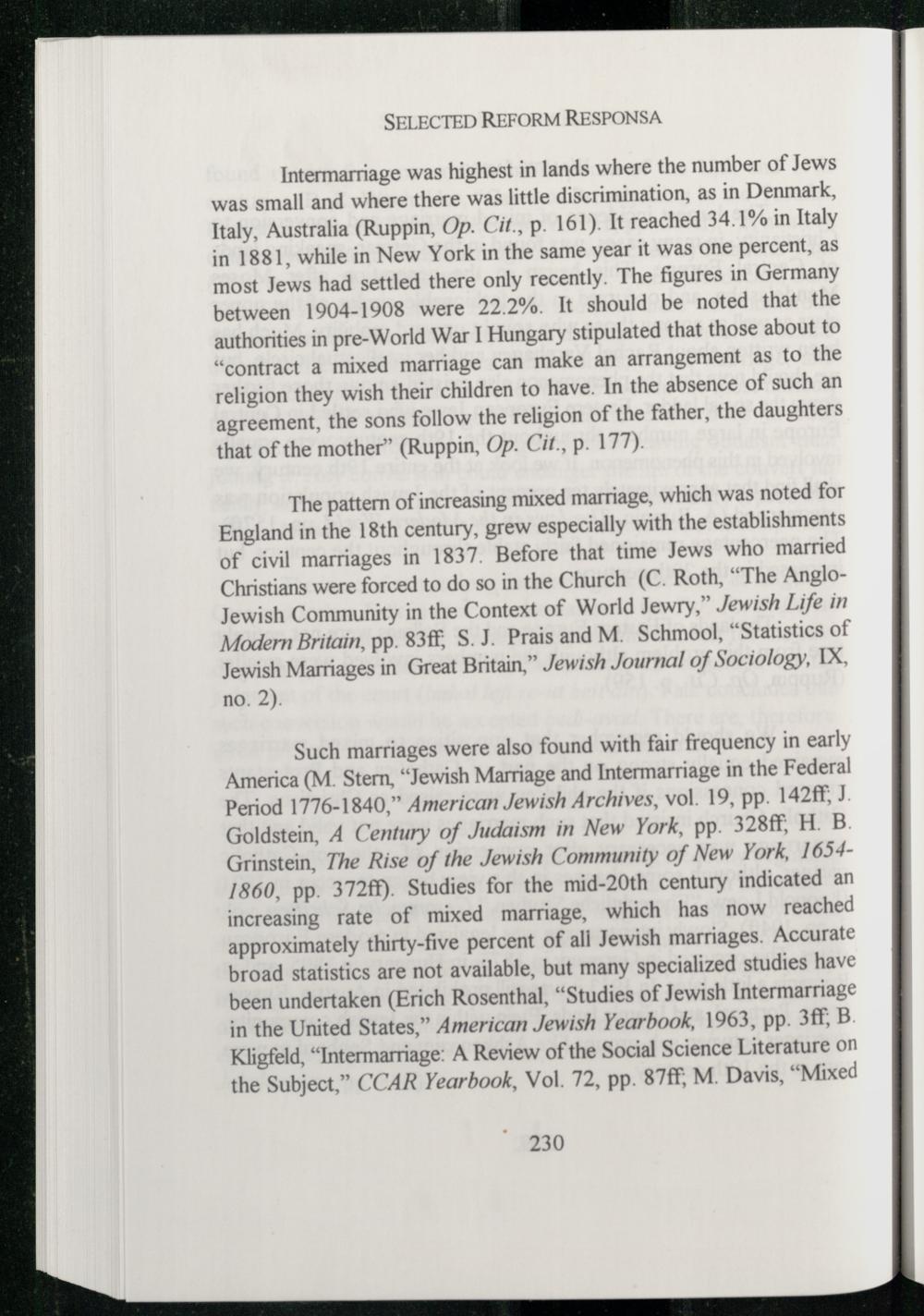 Such marriages were also found with fair frequency in early America (M. Stern,“Jewish Marriage and Intermarriage in the Federal Period 1776-1840,” American Jewish Archives, vol. 19, pp. 142%, J Goldstein, A Century of Judaism in New York , pp. 328ff, H. B. Grinstein, The Rise of the Jewish Community of New York , 16541860, pp. 372fF). Studies for the mid-20th century indicated an increasing rate of mixed marriage, which has now reached approximately thirty-five percent of all Jewish marriages. Accurate broad statistics are not available, but many specialized studies have been undertaken(Erich Rosenthal,“Studies of Jewish Intermarriage in the United States, ” American Jewish Yearbook, 1963, pp. 3ff, B. Kligfeld,“Intermarriage: A Review of the Social Science Literature on the Subject,” CCAR Yearbook, Vol. 72, pp. 87ff, M. Davis,“Mixed