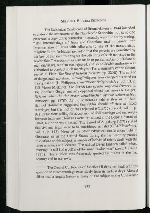 The Central Conference of American Rabbis has dealt with the question of mixed marriage extensively from its earliest days. Mendel Silber read a lengthy historical essay on the subject to the Conference