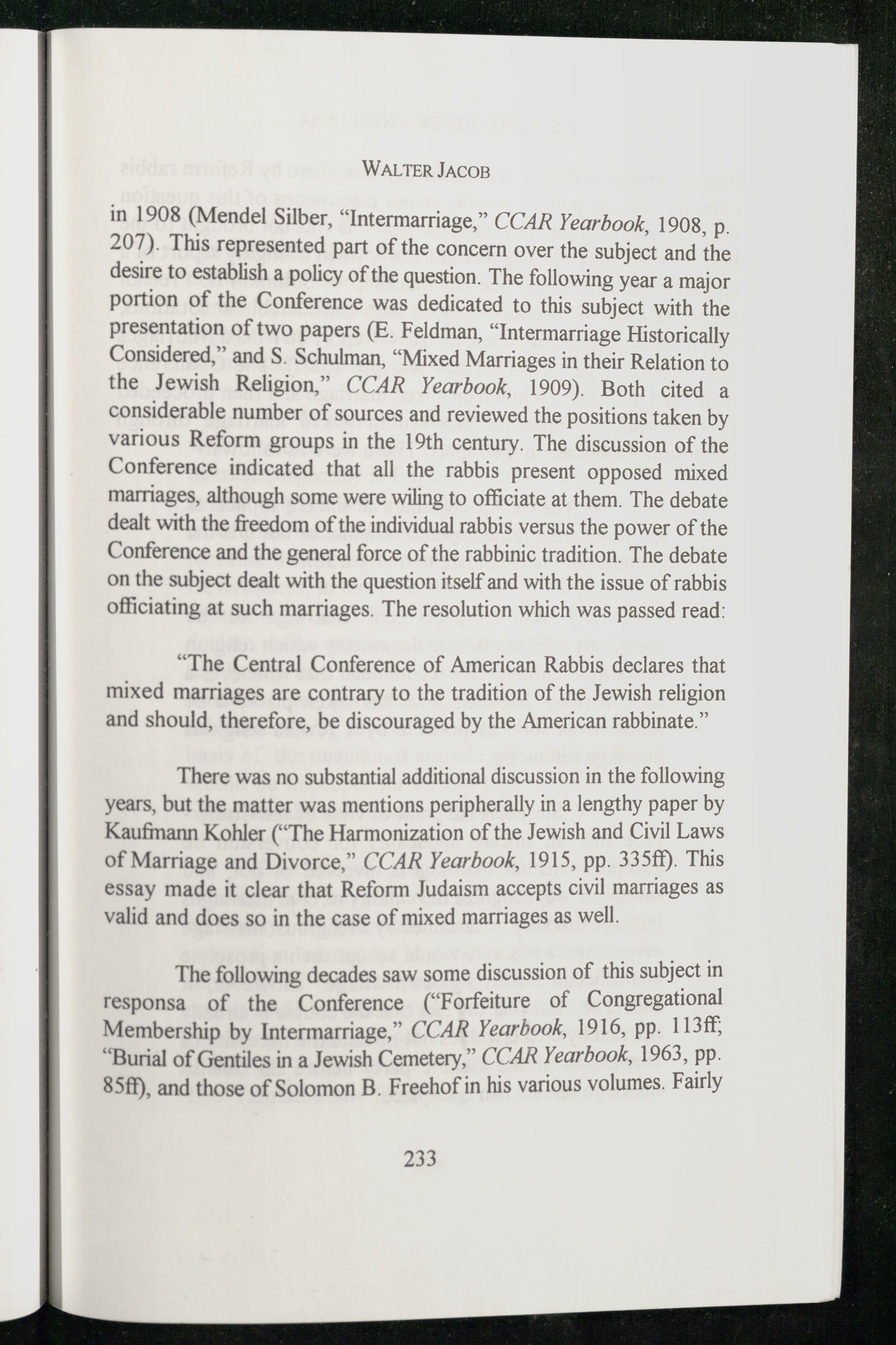 in 1908(Mendel Silber,“Intermarriage, ” CCAR Yearbook, 1908, p. 207). This represented part of the concern over the subject and the desire to establish a policy of the question. The following year a major portion of the Conference was dedicated to this subject with the presentation of two papers(E. Feldman,“Intermarriage Historically Considered,” and S. Schulman,“Mixed Marriages in their Relation to the Jewish Religion,” CCAR Yearbook, 1909). Both cited a considerable number of sources and reviewed the positions taken by various Reform groups in the 19th century. The discussion of the Conference indicated that all the rabbis present opposed mixed marriages, although some were wiling to officiate at them. The debate dealt with the freedom of the individual rabbis versus the power of the Conference and the general force of the rabbinic tradition. The debate on the subject dealt with the question itself and with the issue of rabbis officiating at such marriages. The resolution which was passed read: