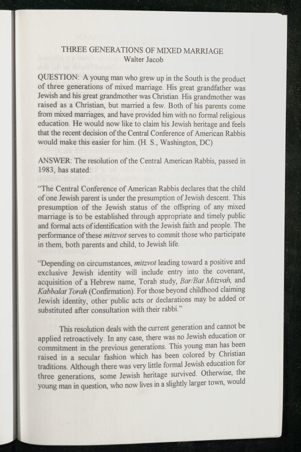 QUESTION: A young man who grew up in the South is the product of three generations of mixed marriage. His great grandfather was Jewish and his great grandmother was Christian . His grandmother was raised as a Christian , but married a few. Both of his parents come from mixed marriages, and have provided him with no formal religious education. He would now like to claim his Jewish heritage and feels that the recent decision of the Central Conference of American Rabbis would make this easier for him.(H. S., Washington, DC )