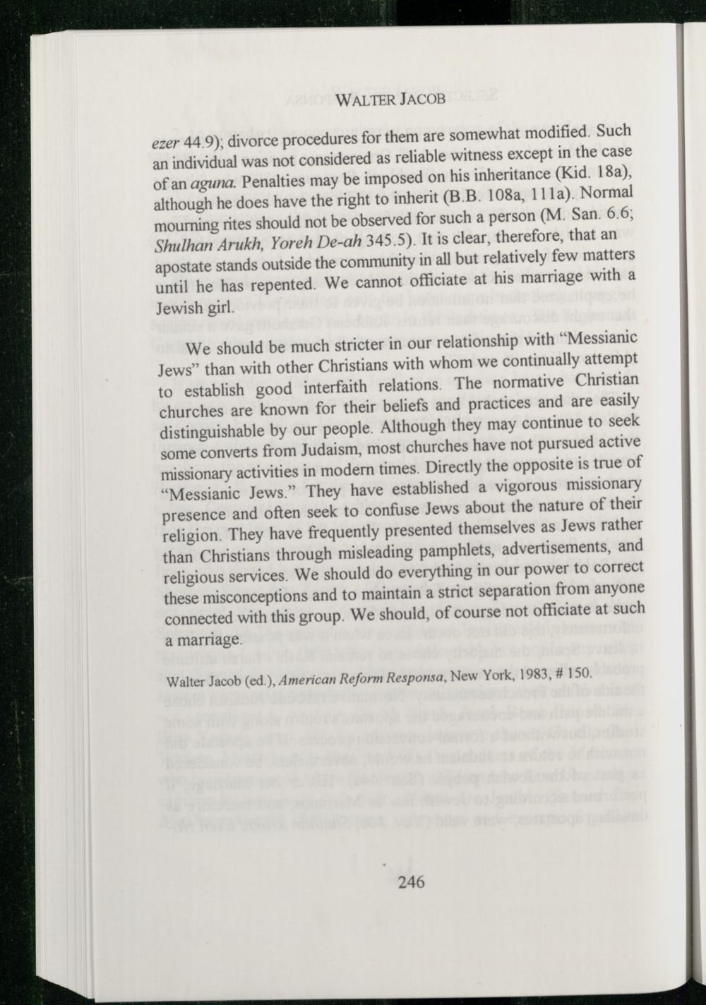 We should be much stricter in our relationship with“Messianic Jews” than with other Christians with whom we continually attempt to establish good interfaith relations. The normative Christian churches are known for their beliefs and practices and are easily distinguishable by our people. Although they may continue to seek some converts from Judaism , most churches have not pursued active missionary activities in modern times. Directly the opposite is true of “Messianic Jews.” They have established a vigorous missionary presence and often seek to confuse Jews about the nature of their religion. They have frequently presented themselves as Jews rather than Christians through misleading pamphlets, advertisements, and religious services. We should do everything in our power to correct these misconceptions and to maintain a strict separation from anyone connected with this group. We should, of course not officiate at such a marriage.