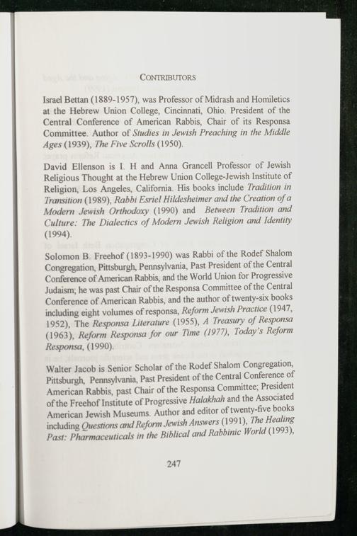 Solomon B. Freehof (1893-1990) was Rabbi of the Rodef Shalom Congregation, Pittsburgh , Pennsylvania , Past President of the Central Conference of American Rabbis, and the World Union for Progressive Judaism : he was past Chair of the Responsa Committee of the Central Conference of American Rabbis, and the author of twenty-six books including eight volumes of responsa, Reform Jewish Practice(1947, 1952), The Responsa Literature(1955), A Treasury of Responsa (1963), Reform Responsa for our Time(1977), Today's Reform Responsa,(1990).
