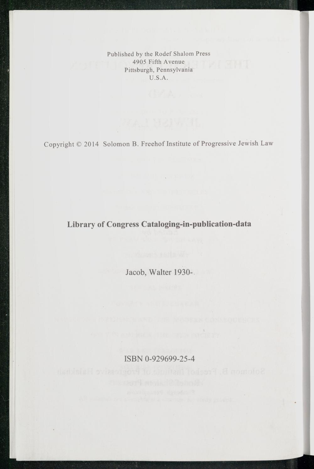 Published by the Rodef Shalom Press 4905 Fifth Avenue Pittsburgh , Pennsylvania Copyright© 2014 Solomon B. Freehof Institute of Progressive Jewish Law Library of Congress Cataloging-in-publication-data Jacob, Walter 1930[SBN 0-929699-25-4