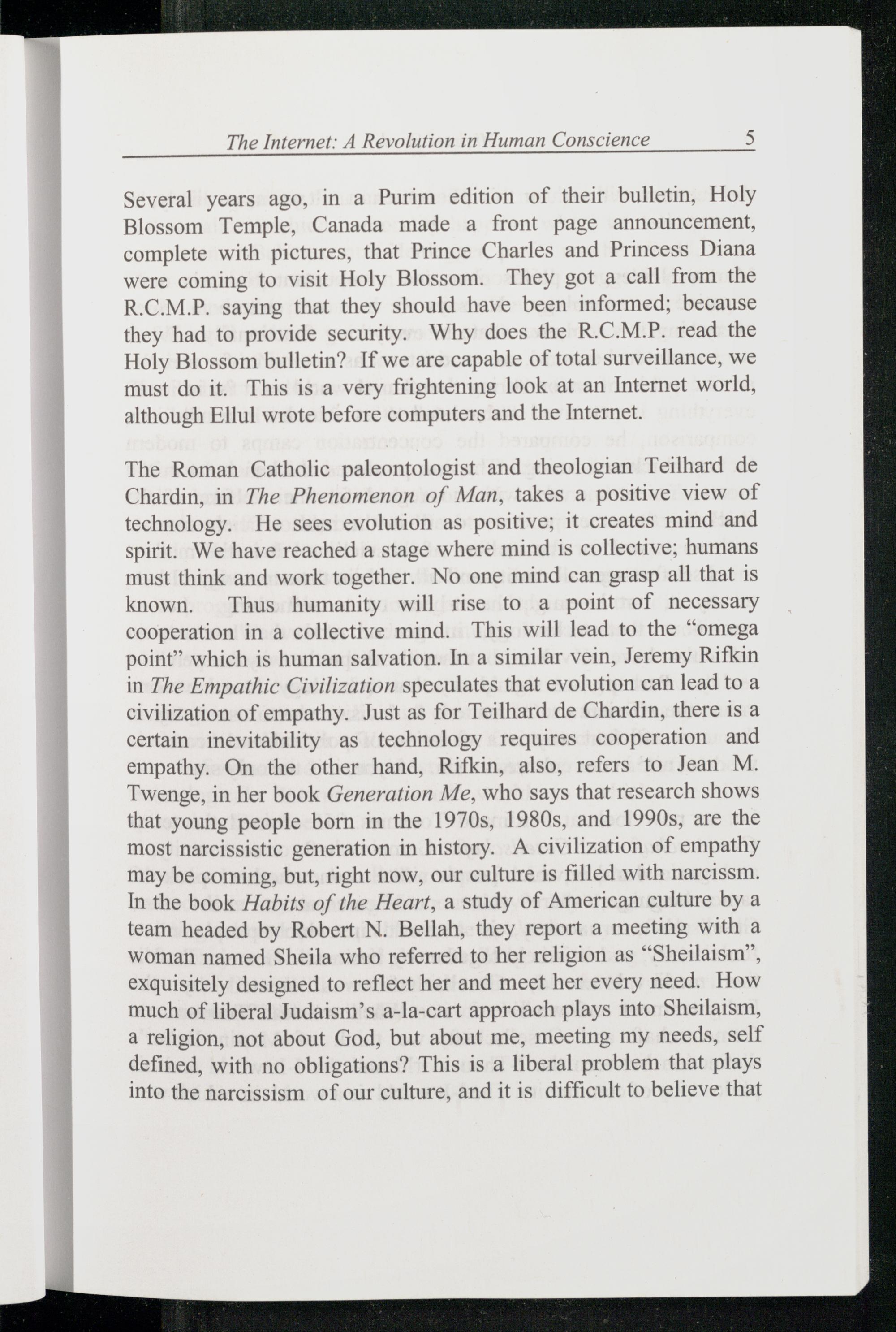 The Roman Catholic paleontologist and theologian Teilhard de Chardin , in The Phenomenon of Man, takes a positive view of technology. He sees evolution as positive; it creates mind and spirit. We have reached a stage where mind is collective; humans must think and work together. No one mind can grasp all that is known. Thus humanity will rise to a point of necessary cooperation in a collective mind. This will lead to the“omega point” which is human salvation. In a similar vein, Jeremy Rifkin in The Empathic Civilization speculates that evolution can lead to a civilization of empathy. Just as for Teilhard de Chardin , there is a certain inevitability as technology requires cooperation and empathy. On the other hand, Rifkin , also, refers to Jean M. Twenge , in her book Generation Me, who says that research shows that young people born in the 1970s, 1980s, and 1990s, are the most narcissistic generation in history. A civilization of empathy may be coming, but, right now, our culture is filled with narcissm. In the book Habits of the Heart, a study of American culture by a team headed by Robert N. Bellah , they report a meeting with a woman named Sheila who referred to her religion as“Sheilaism”, exquisitely designed to reflect her and meet her every need. How much of liberal Judaism ’s a-la-cart approach plays into Sheilaism, a religion, not about God , but about me, meeting my needs, self defined, with no obligations? This is a liberal problem that plays into the narcissism of our culture, and it is difficult to believe that