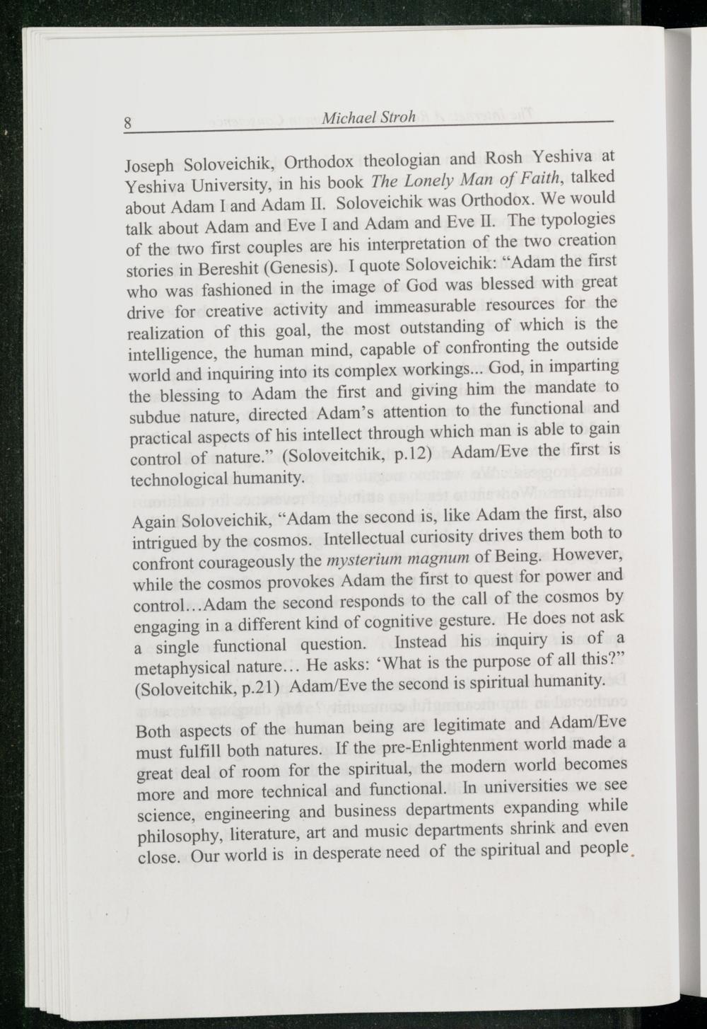 8 Michael Stroh Joseph Soloveichik, Orthodox theologian and Rosh Yeshiva at Yeshiva University , in his book The Lonely Man of Faith, talked about Adam I and Adam II. Soloveichik was Orthodox . We would talk about Adam and Eve I and Adam and Eve II. The typologies of the two first couples are his interpretation of the two creation stories in Bereshit(Genesis). I quote Soloveichik:“Adam the first who was fashioned in the image of God was blessed with great drive for creative activity and immeasurable resources for the realization of this goal, the most outstanding of which is the intelligence, the human mind, capable of confronting the outside world and inquiring into its complex workings... God , in imparting the blessing to Adam the first and giving him the mandate to subdue nature, directed Adam’s attention to the functional and practical aspects of his intellect through which man is able to gain control of nature.”(Soloveitchik , p.12) Adam/Eve the first is technological humanity.