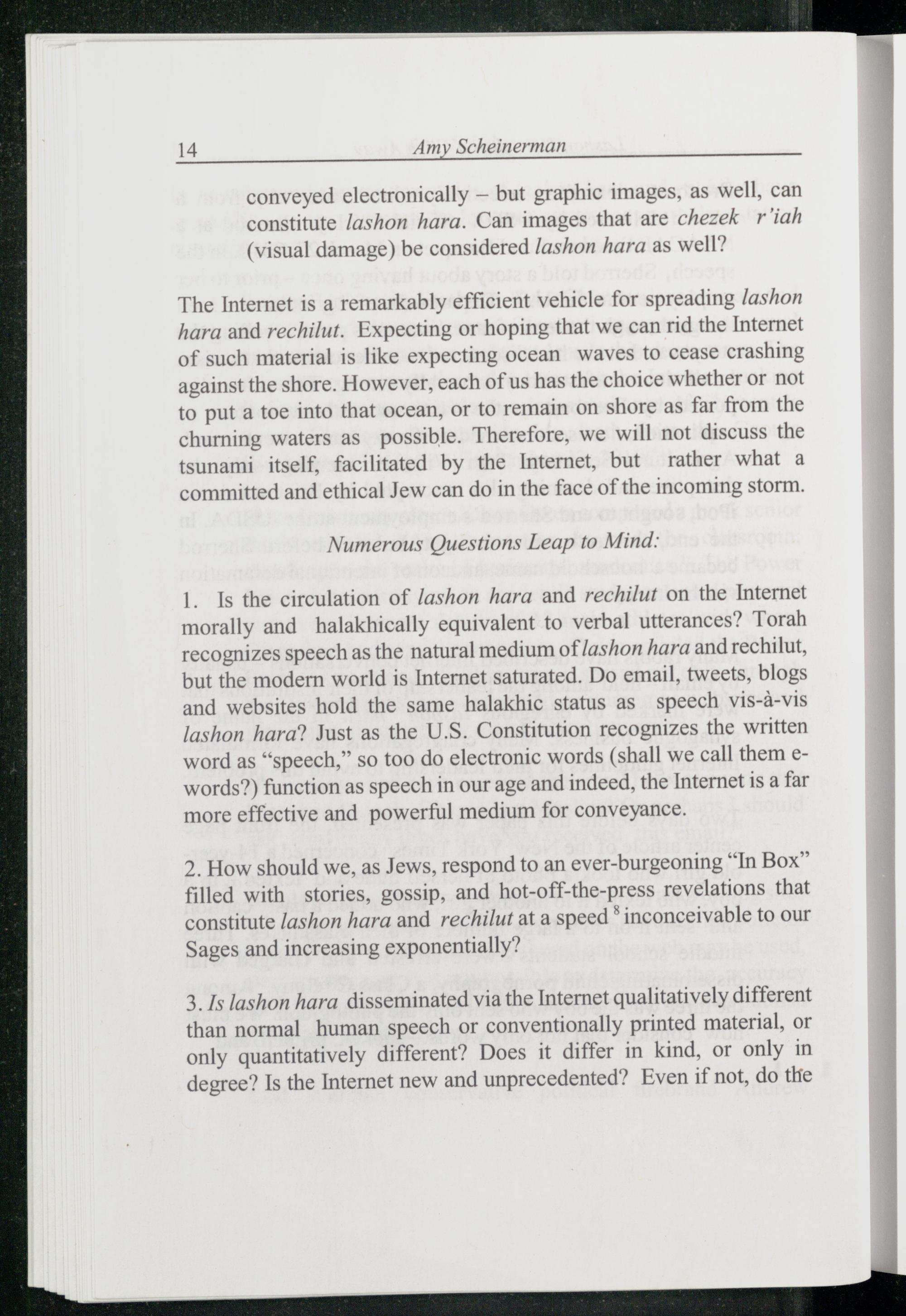 3. Is lashon hara disseminated via the Internet qualitatively different than normal human speech or conventionally printed material, or only quantitatively different? Does it differ in kind, or only in degree? Is the Internet new and unprecedented? Even if not, do the