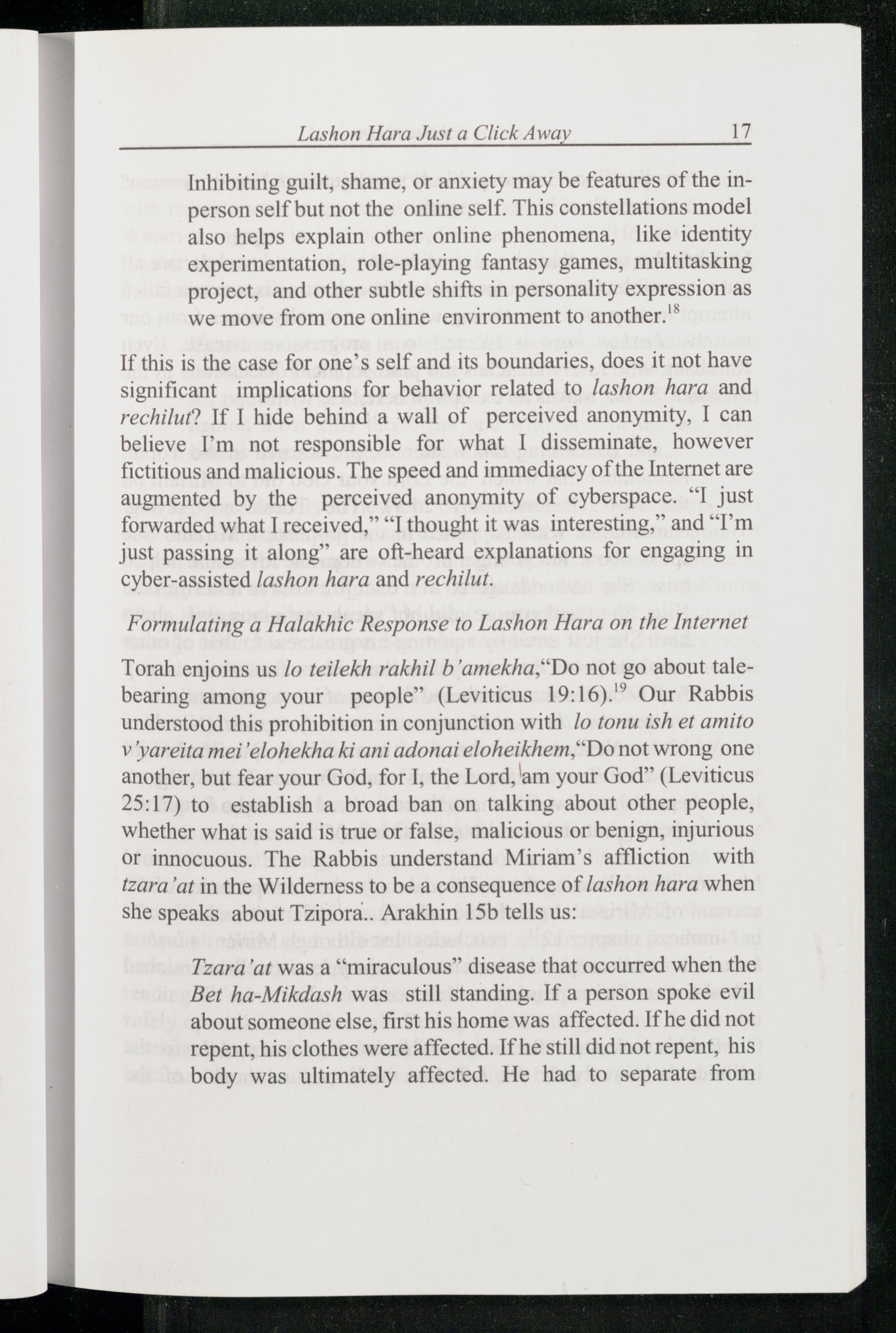 If this is the case for one’s self and its boundaries, does it not have significant implications for behavior related to /ashon hara and rechilut? If 1 hide behind a wall of perceived anonymity, I can believe I’m not responsible for what 1 disseminate, however fictitious and malicious. The speed and immediacy of the Internet are augmented by the perceived anonymity of cyberspace.“I just forwarded what I received,”“I thought it was interesting,” and“I'm just passing it along” are oft-heard explanations for engaging in cyber-assisted lashon hara and rechilut.