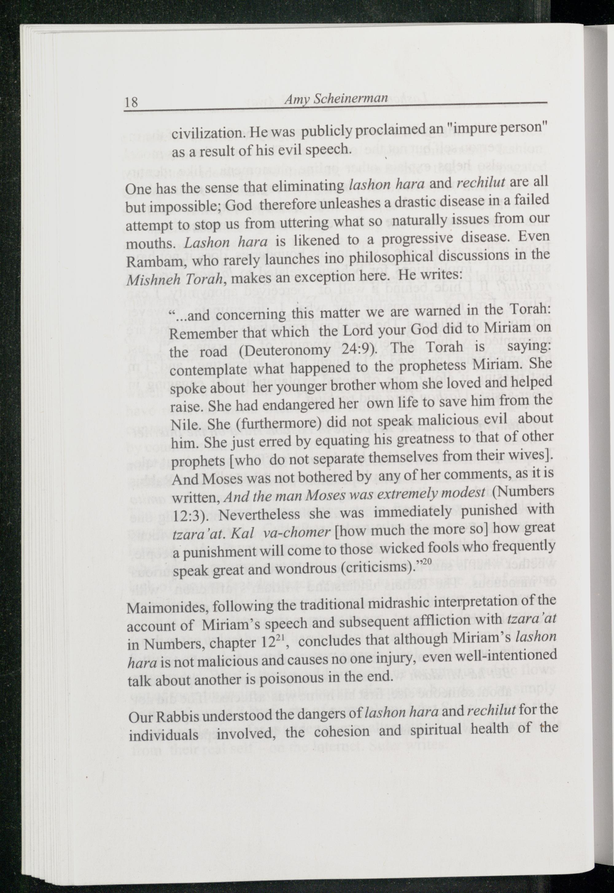 « and concerning this matter we are warned in the Torah : Remember that which the Lord your God did to Miriam on the road(Deuteronomy 24:9). The Torah is saying: contemplate what happened to the prophetess Miriam . She spoke about her younger brother whom she loved and helped raise. She had endangered her own life to save him from the Nile. She(furthermore) did not speak malicious evil about him. She just erred by equating his greatness to that of other prophets[who do not separate themselves from their wives]. And Moses was not bothered by any of her comments, as it is written, And the man Moses was extremely modest(Numbers 12:3). Nevertheless she was immediately punished with tzara’at. Kal va-chomer[how much the more so] how great a punishment will come to those wicked fools who frequently speak great and wondrous(criticisms).