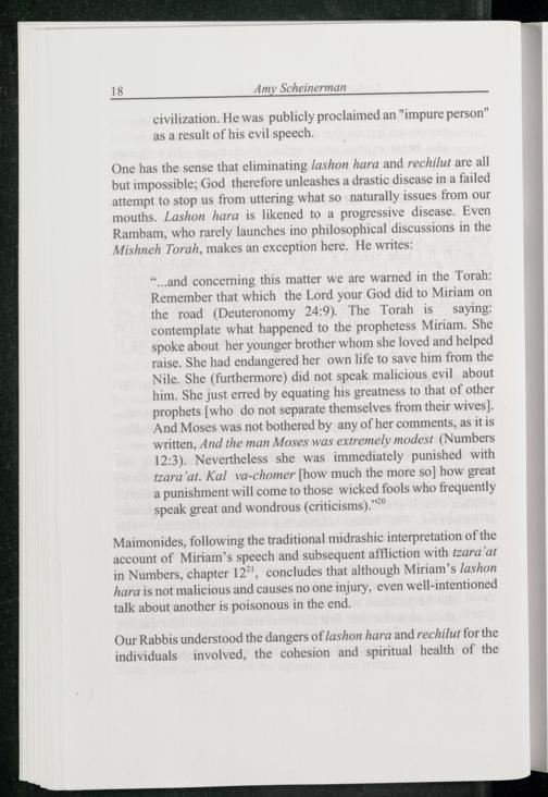 Maimonides , following the traditional midrashic interpretation of the account of Miriam ’s speech and subsequent affliction with tzara’at in Numbers, chapter 122!, concludes that although Miriam ’s lashon hara is not malicious and causes no one injury, even well-intentioned talk about another is poisonous in the end.