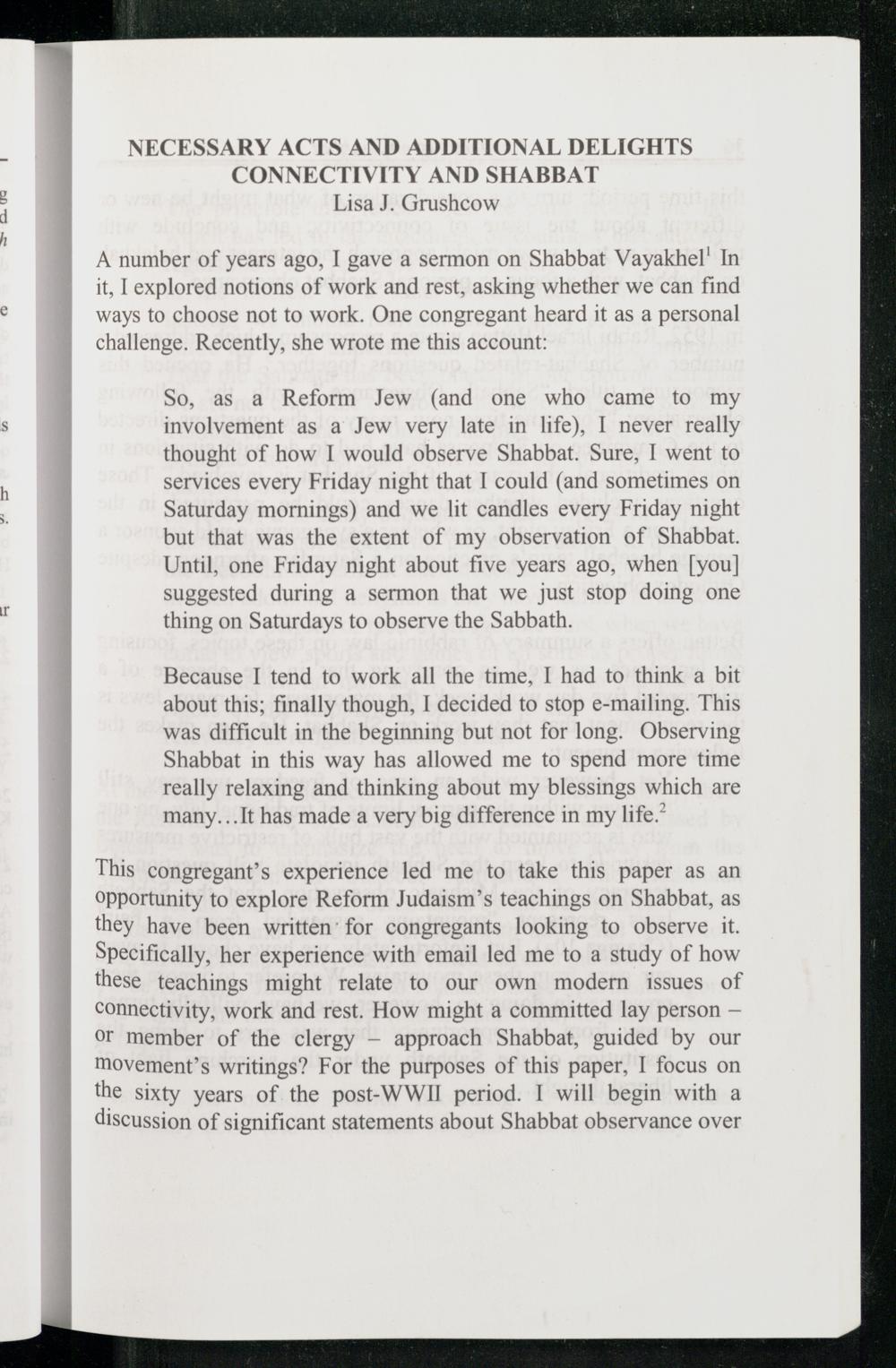 This congregant’s experience led me to take this paper as an opportunity to explore Reform Judaism’s teachings on Shabbat , as they have been written’ for congregants looking to observe it. Specifically, her experience with email led me to a study of how these teachings might relate to our own modern issues of connectivity, work and rest. How might a committed lay person— or member of the clergy— approach Shabbat , guided by our movement’s writings? For the purposes of this paper, I focus on the sixty years of the post-WWII period. 1 will begin with a discussion of significant statements about Shabbat observance over