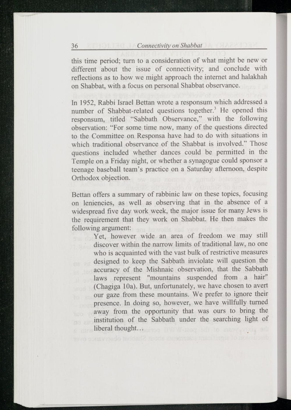 Bettan offers a summary of rabbinic law on these topics, focusing on leniencies, as well as observing that in the absence of a widespread five day work week, the major issue for many Jews is the requirement that they work on Shabbat . He then makes the following argument: Yet, however wide an area of freedom we may still discover within the narrow limits of traditional law, no one who is acquainted with the vast bulk of restrictive measures designed to keep the Sabbath inviolate will question the accuracy of the Mishnaic observation, that the Sabbath laws represent"mountains suspended from a hair" (Chagiga 10a). But, unfortunately, we have chosen to avert our gaze from these mountains. We prefer to ignore their presence. In doing so, however, we have willfully turned away from the opportunity that was ours to bring the institution of the Sabbath under the searching light of liberal thought...