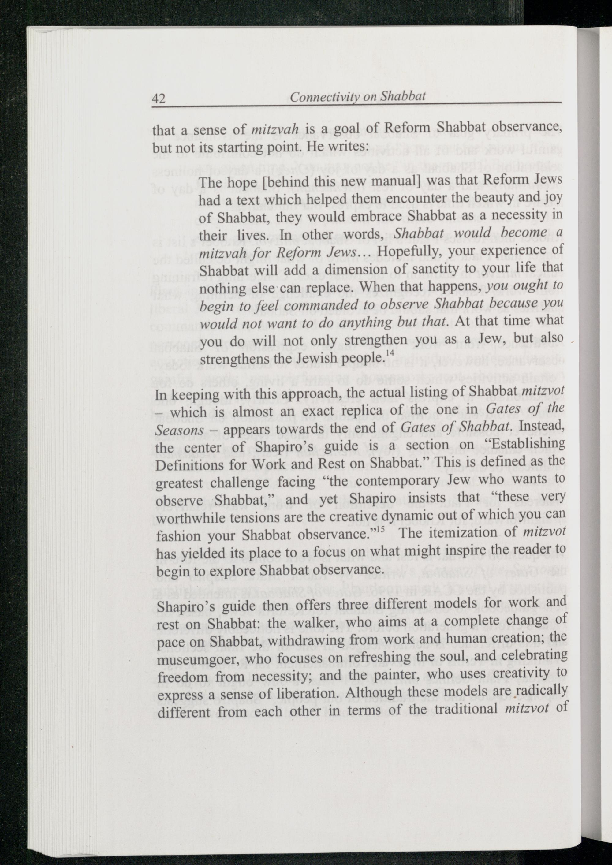 In keeping with this approach, the actual listing of Shabbat mitzvot _ which is almost an exact replica of the one in Gates of the Seasons— appears towards the end of Gates of Shabbat. Instead, the center of Shapiro ’s guide is a section on“Establishing Definitions for Work and Rest on Shabbat .” This is defined as the greatest challenge facing“the contemporary Jew who wants to observe Shabbat, ” and yet Shapiro insists that“these very worthwhile tensions are the creative dynamic out of which you can fashion your Shabbat observance.”® The itemization of mitzvot has yielded its place to a focus on what might inspire the reader to begin to explore Shabbat observance.