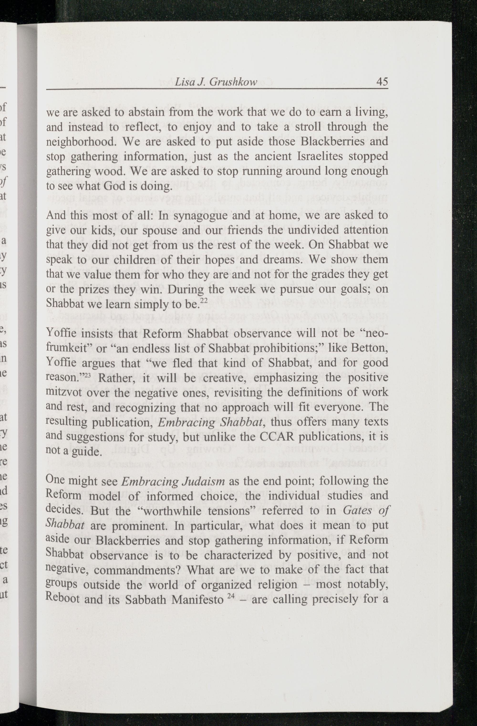 Yoffie insists that Reform Shabbat observance will not be“neofrumkeit” or“an endless list of Shabbat prohibitions; like Betton, Yoffie argues that“we fled that kind of Shabbat , and for good reason.” Rather, it will be creative, emphasizing the positive mitzvot over the negative ones, revisiting the definitions of work and rest, and recognizing that no approach will fit everyone. The resulting publication, Embracing Shabbat , thus offers many texts and suggestions for study, but unlike the CCAR publications, it is not a guide.