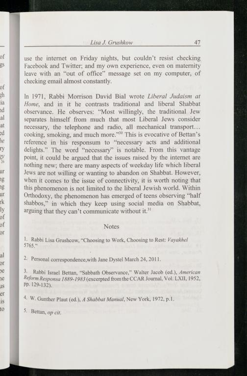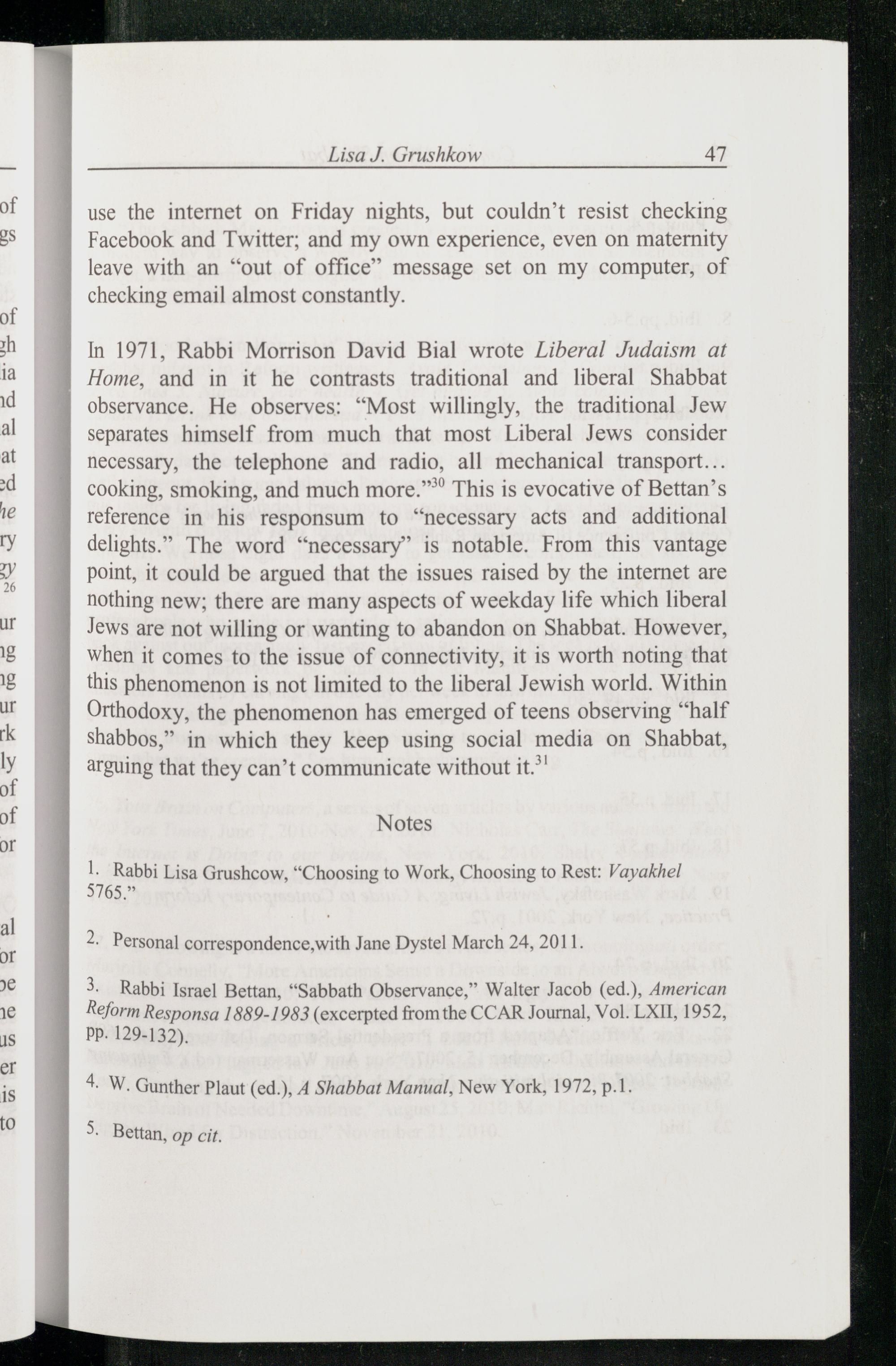 3 Rabbi Israel Bettan,“Sabbath Observance, ” Walter Jacob (ed.), American Reform Responsa 1889-1983(excerpted from the CCAR Journal, Vol. LXII, 1952, pp. 129-132).
