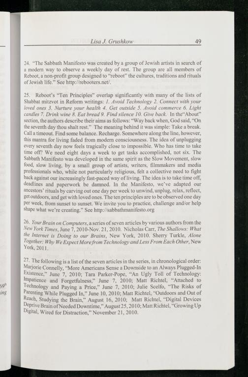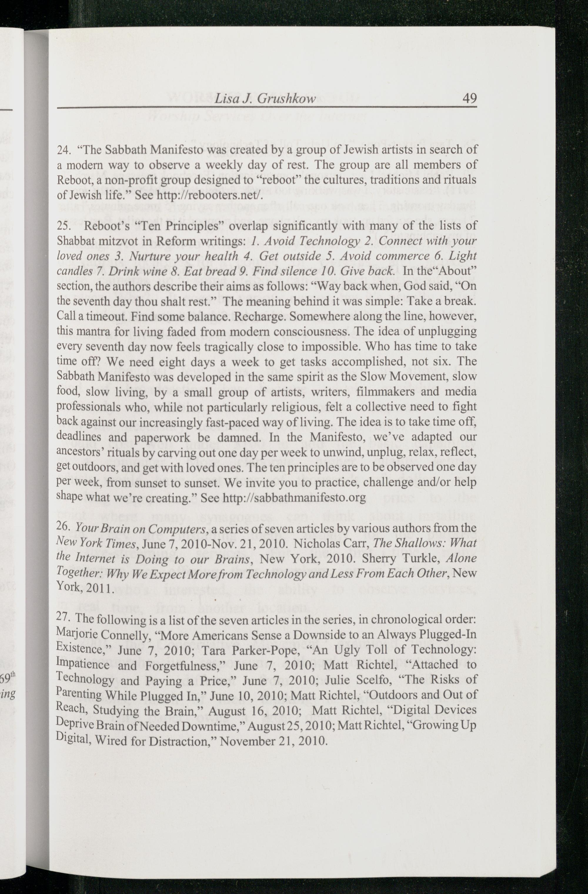 25. Reboot’s“Ten Principles” overlap significantly with many of the lists of Shabbat mitzvot in Reform writings: /. Avoid Technology 2. Connect with your loved ones 3. Nurture your health 4. Get outside 5. Avoid commerce 6. Light candles 7. Drink wine 8. Eat bread 9. Find silence 10. Give back. In the“About” section, the authors describe their aims as follows:“Way back when, God said,“On the seventh day thou shalt rest.” The meaning behind it was simple: Take a break. Call a timeout. Find some balance. Recharge. Somewhere along the line, however, this mantra for living faded from modern consciousness. The idea of unplugging every seventh day now feels tragically close to impossible. Who has time to take time off? We need eight days a week to get tasks accomplished, not six. The Sabbath Manifesto was developed in the same spirit as the Slow Movement, slow food, slow living, by a small group of artists, writers, filmmakers and media professionals who, while not particularly religious, felt a collective need to fight back against our increasingly fast-paced way of living. The idea is to take time off, deadlines and paperwork be damned. In the Manifesto , we’ve adapted our ancestors’ rituals by carving out one day per week to unwind, unplug, relax, reflect, getoutdoors, and get with loved ones. The ten principles are to be observed one day per week, from sunset to sunset. We invite you to practice, challenge and/or help shape what we’re creating.” See http:/sabbathmanifesto.org