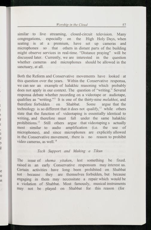 Both the Reform and Conservative movements have looked at this question over the years. Within the Conservative responsa, we can see an example of halakhic reasoning which probably does not apply in our context. The question of“writing.” Several responsa debate whether recording on a videotape or audiotape, qualifies as“writing.”'' It is one of the thirty-nine melakhot, and therefore forbidden on Shabbat . Some argue that the technology is so different that it does not qualify,'> while others state that the function of videotaping is essentially identical to writing, and therefore must fall under the same halakhic prohibitions.” Still others argue that videotaping s actually most similar to audio amplification(i.e. the use of microphones), and since microphones are explicitly allowed in the Conservative movement, there is no reason to prohibit video cameras, as well."
