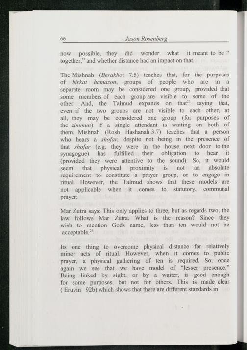 Its one thing to overcome physical distance for relatively minor acts of ritual. However, when it comes to public prayer, a physical gathering of ten is required. So, once again we see that we have model of“lesser presence.” Being linked by sight, or by a waiter, is good enough for some purposes, but not for others. This is made clear ( Eruvin 92b) which shows that there are different standards in