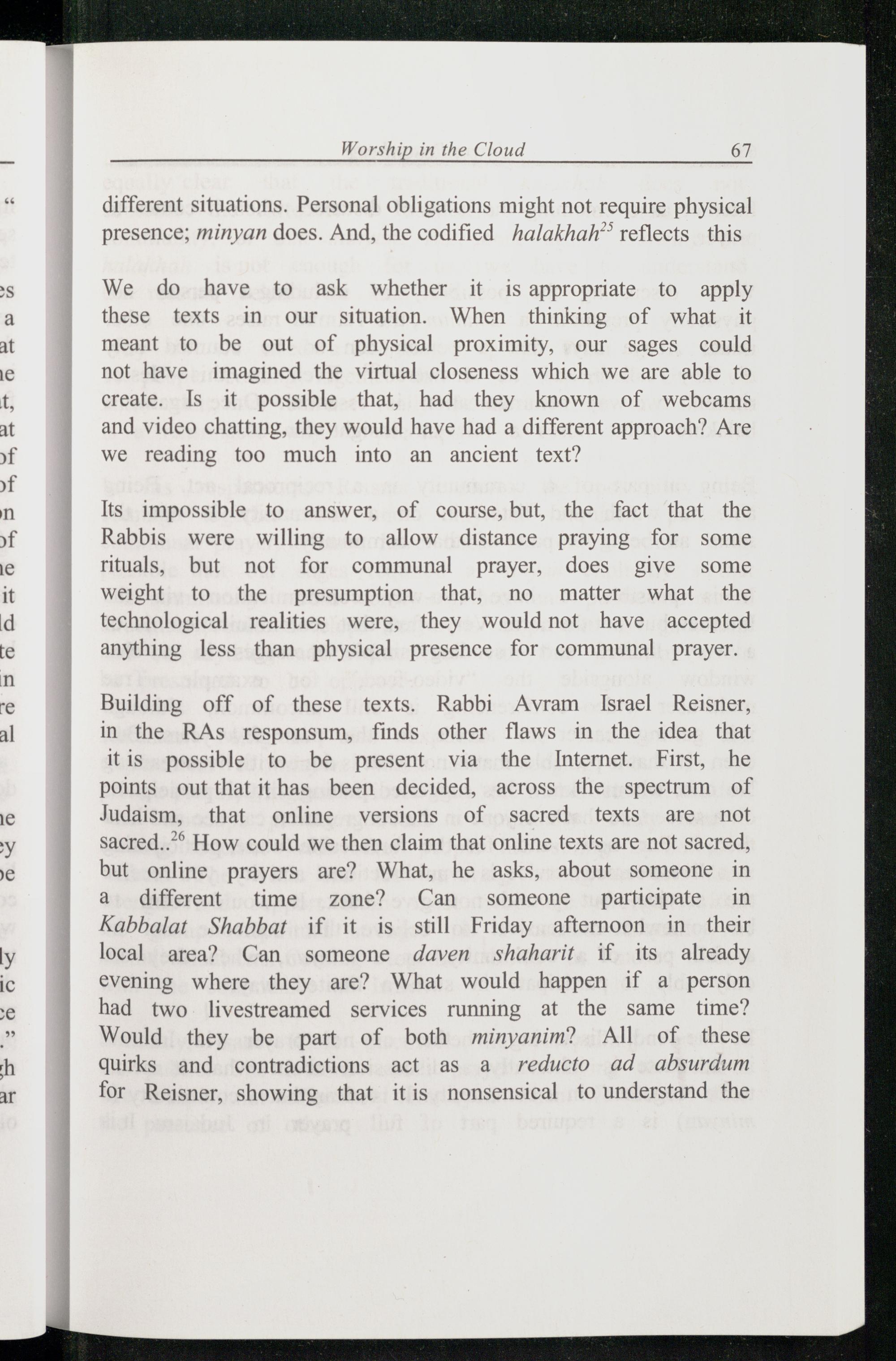 Building off of these texts. Rabbi Avram Israel Reisner, in the RAs responsum, finds other flaws in the idea that itis possible to be present via the Internet. First, he points out that it has been decided, across the spectrum of Judaism , that online versions of sacred texts are not sacred..”® How could we then claim that online texts are not sacred, but online prayers are? What, he asks, about someone in a different time zone? Can someone participate in Kabbalat Shabbat if it is still Friday afternoon in their local area? Can someone daven shaharit if its already evening where they are? What would happen if a person had two livestreamed services running at the same time? Would they be part of both minyanim? All of these quirks and contradictions act as a reducto ad absurdum for Reisner, showing that itis nonsensical to understand the