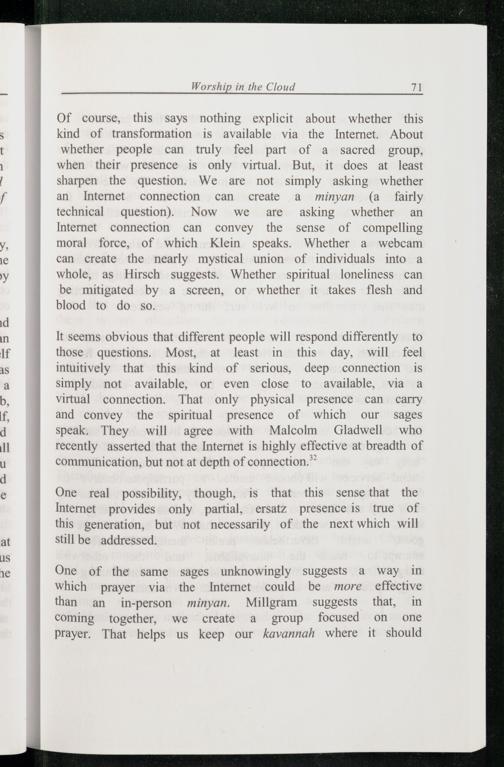 Of course, this says nothing explicit about whether this kind of transformation is available via the Internet. About whether people can truly feel part of a sacred group, when their presence is only virtual. But, it does at least sharpen the question. We are not simply asking whether an Internet connection can create a minyan(a fairly technical question). Now we are asking whether an Internet connection can convey the sense of compelling moral force, of which Klein speaks. Whether a webcam can create the nearly mystical union of individuals into a whole, as Hirsch suggests. Whether spiritual loneliness can be mitigated by a screen, or whether it takes flesh and blood to do so.