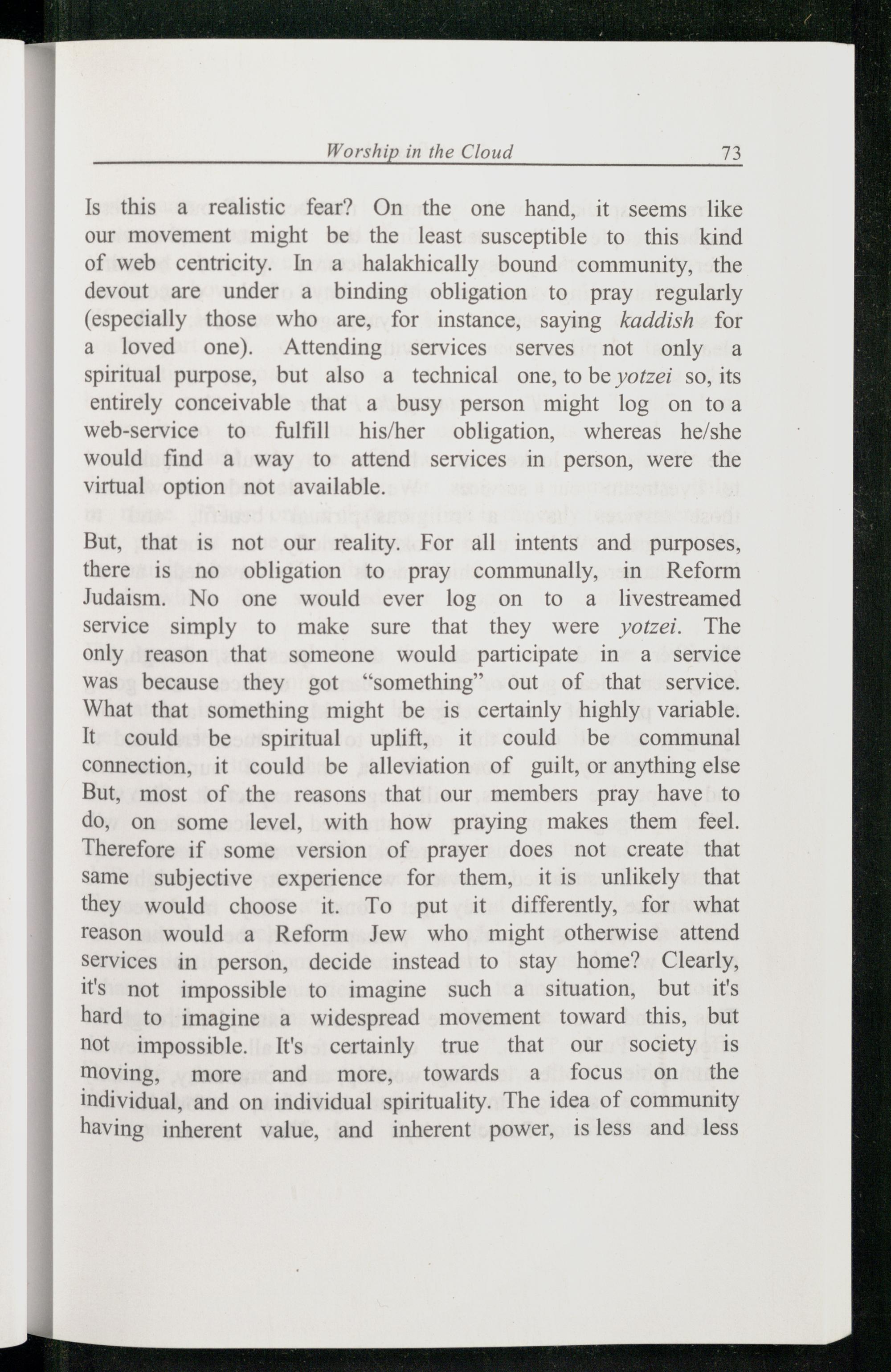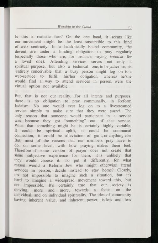 Is this a realistic fear? On the one hand, it seems like our movement might be the least susceptible to this kind of web centricity. In a halakhically bound community, the devout are under a binding obligation to pray regularly (especially those who are, for instance, saying kaddish for a loved one). Attending services serves not only a spiritual purpose, but also a technical one, to be yorzei so, its entirely conceivable that a busy person might log on toa web-service to fulfill his/her obligation, whereas he/she would find a way to attend services in person, were the virtual option not available.