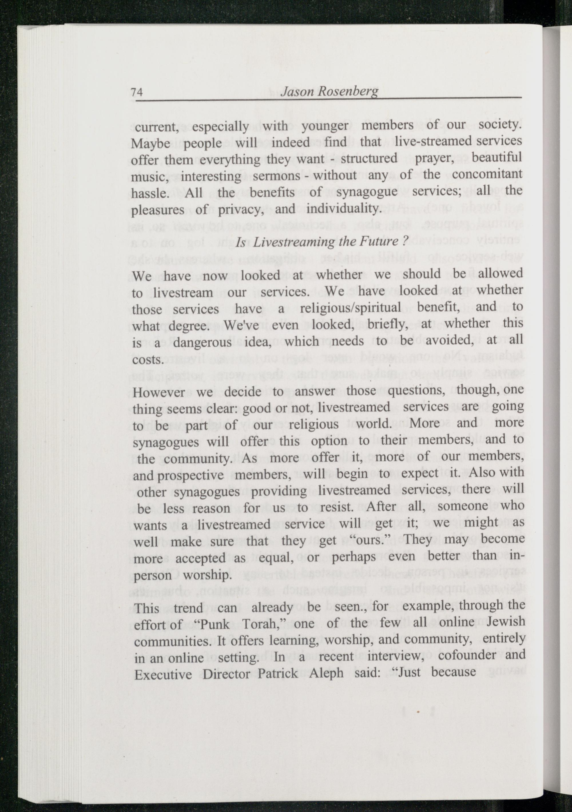 However we decide to answer those questions, though, one thing seems clear: good or not, livestreamed services are going to be part of our religious world. More and more synagogues will offer this option to their members, and to the community. As more offer it, more of our members, and prospective members, will begin to expect it. Also with other synagogues providing livestreamed services, there will be less reason for us to resist. After all, someone who wants a livestreamed service will get it; we might as well make sure that they get“ours.” They may become more accepted as equal, or perhaps even better than inperson worship.