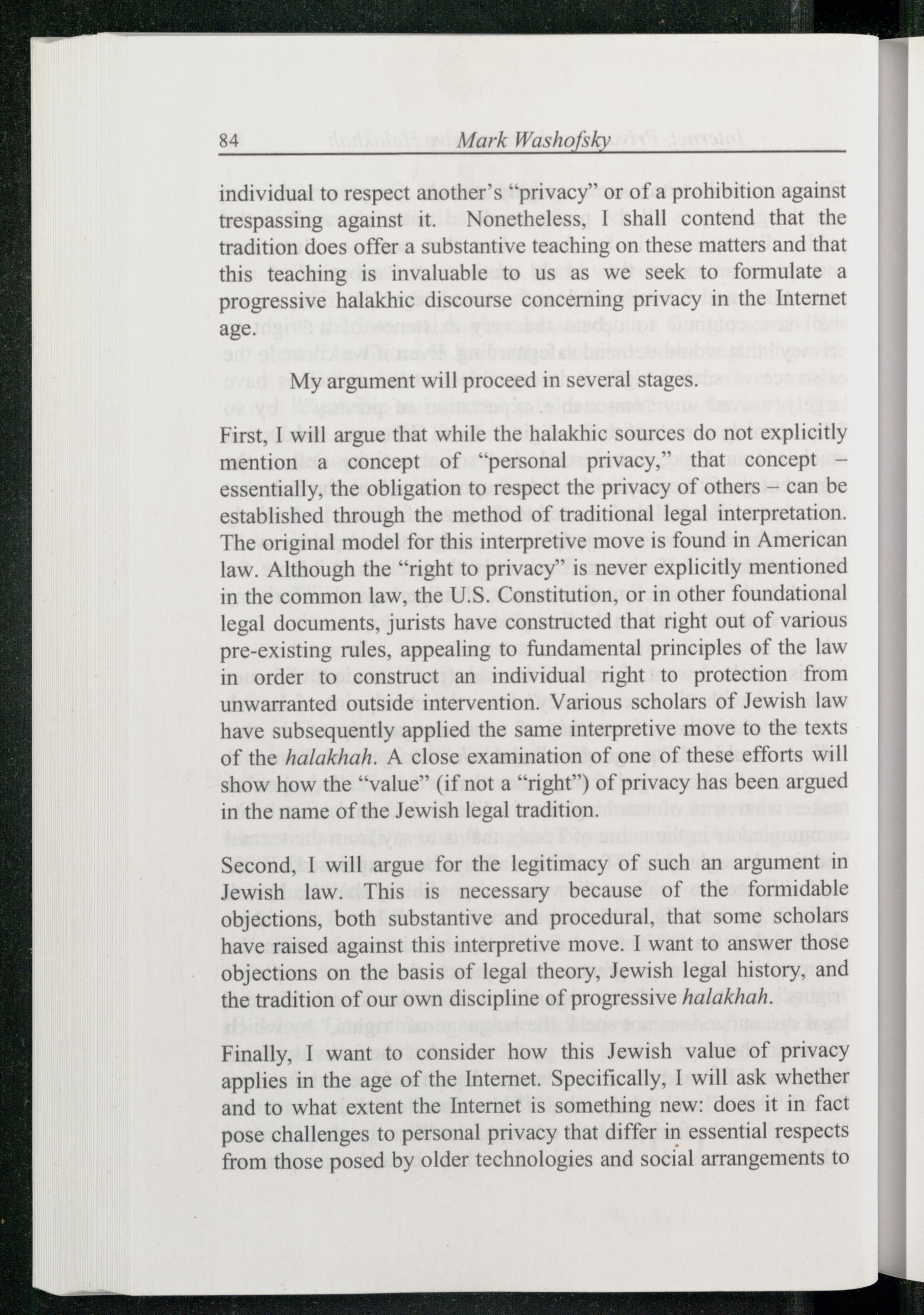 First, I will argue that while the halakhic sources do not explicitly mention a concept of“personal privacy,” that concept— essentially, the obligation to respect the privacy of others— can be established through the method of traditional legal interpretation. The original model for this interpretive move is found in American law. Although the“right to privacy” is never explicitly mentioned in the common law, the U.S. Constitution , or in other foundational legal documents, jurists have constructed that right out of various pre-existing rules, appealing to fundamental principles of the law in order to construct an individual right to protection from unwarranted outside intervention. Various scholars of Jewish law have subsequently applied the same interpretive move to the texts of the halakhah. A close examination of one of these efforts will show how the“value”(if not a“right”) of privacy has been argued in the name of the Jewish legal tradition.