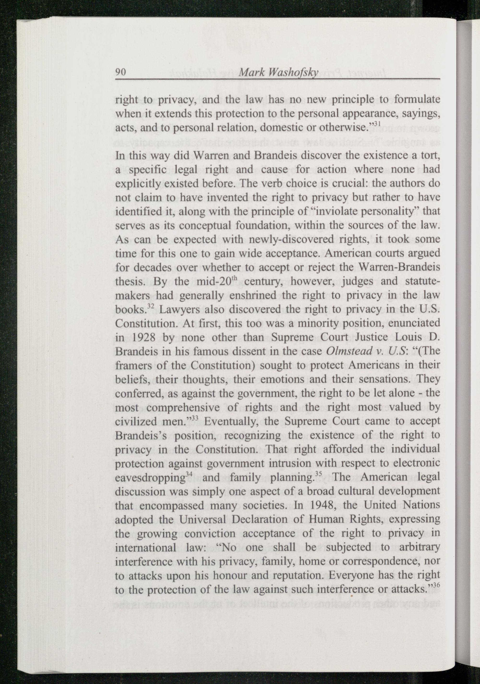 In this way did Warren and Brandeis discover the existence a tort, a specific legal right and cause for action where none had explicitly existed before. The verb choice is crucial: the authors do not claim to have invented the right to privacy but rather to have identified it, along with the principle of“inviolate personality” that serves as its conceptual foundation, within the sources of the law. As can be expected with newly-discovered rights, it took some time for this one to gain wide acceptance. American courts argued for decades over whether to accept or reject the Warren-Brandeis thesis. By the mid-20" century, however, judges and statutemakers had generally enshrined the right to privacy in the law books.” Lawyers also discovered the right to privacy in the U.S. Constitution . At first, this too was a minority position, enunciated in 1928 by none other than Supreme Court Justice Louis D. Brandeis in his famous dissent in the case Olmstead v. U.S:“(The framers of the Constitution ) sought to protect Americans in their beliefs, their thoughts, their emotions and their sensations. They conferred, as against the government, the right to be let alone- the most comprehensive of rights and the right most valued by civilized men.” Eventually, the Supreme Court came to accept Brandeis ’s position, recognizing the existence of the right to privacy in the Constitution . That right afforded the individual protection against government intrusion with respect to electronic eavesdropping®® and family planning.”® The American legal discussion was simply one aspect of a broad cultural development that encompassed many societies. In 1948, the United Nations adopted the Universal Declaration of Human Rights , expressing the growing conviction acceptance of the right to privacy in international law:“No one shall be subjected to arbitrary interference with his privacy, family, home or correspondence, nor to attacks upon his honour and reputation. Everyone has the right to the protection of the law against such interference or attacks.”