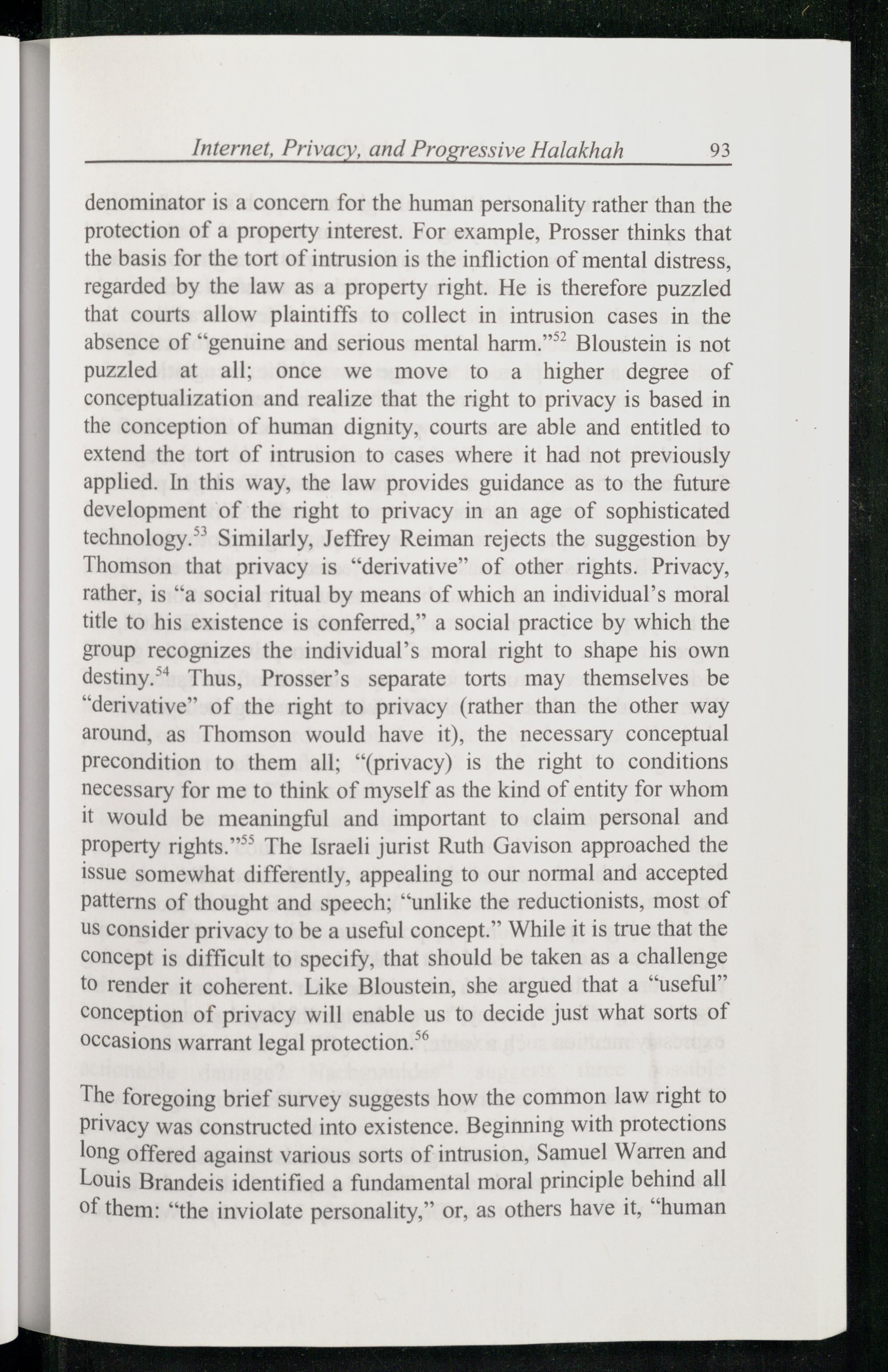 denominator is a concern for the human personality rather than the protection of a property interest. For example, Prosser thinks that the basis for the tort of intrusion is the infliction of mental distress, regarded by the law as a property right. He is therefore puzzled that courts allow plaintiffs to collect in intrusion cases in the absence of“genuine and serious mental harm.” Bloustein is not puzzled at all; once we move to a higher degree of conceptualization and realize that the right to privacy is based in the conception of human dignity, courts are able and entitled to extend the tort of intrusion to cases where it had not previously applied. In this way, the law provides guidance as to the future development of the right to privacy in an age of sophisticated technology.” Similarly, Jeffrey Reiman rejects the suggestion by Thomson that privacy is“derivative” of other rights. Privacy, rather, is“a social ritual by means of which an individual’s moral title to his existence is conferred,” a social practice by which the group recognizes the individual’s moral right to shape his own destiny.” Thus, Prosser’s separate torts may themselves be “derivative” of the right to privacy(rather than the other way around, as Thomson would have it), the necessary conceptual precondition to them all;“(privacy) is the right to conditions necessary for me to think of myself as the kind of entity for whom it would be meaningful and important to claim personal and property rights.” The Israeli jurist Ruth Gavison approached the issue somewhat differently, appealing to our normal and accepted patterns of thought and speech;“unlike the reductionists, most of us consider privacy to be a useful concept.” While it is true that the concept is difficult to specify, that should be taken as a challenge to render it coherent. Like Bloustein, she argued that a“useful” conception of privacy will enable us to decide just what sorts of occasions warrant legal protection.*