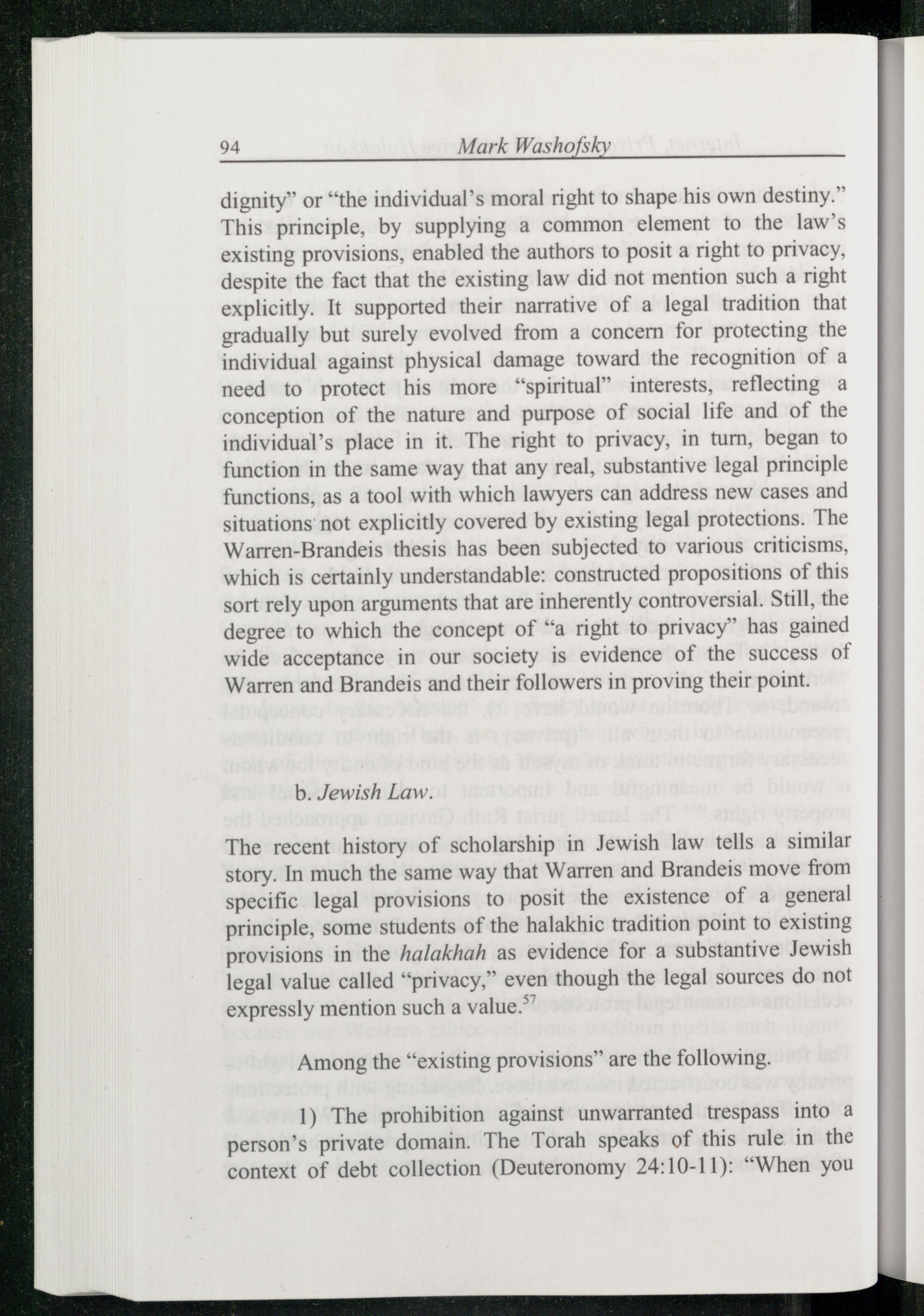 The recent history of scholarship in Jewish law tells a similar story. In much the same way that Warren and Brandeis move from specific legal provisions to posit the existence of a general principle, some students of the halakhic tradition point to existing provisions in the halakhah as evidence for a substantive Jewish legal value called“privacy,” even though the legal sources do not expressly mention such a value.”