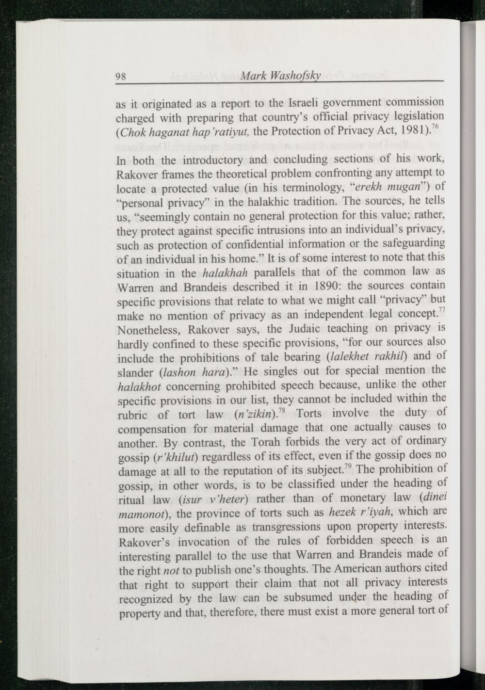 In both the introductory and concluding sections of his work, Rakover frames the theoretical problem confronting any attempt to locate a protected value(in his terminology,“erekh mugan’) of “personal privacy” in the halakhic tradition. The sources, he tells us,“seemingly contain no general protection for this value; rather, they protect against specific intrusions into an individual’s privacy, such as protection of confidential information or the safeguarding of an individual in his home.” It is of some interest to note that this situation in the halakhah parallels that of the common law as Warren and Brandeis described it in 1890: the sources contain specific provisions that relate to what we might call“privacy” but make no mention of privacy as an independent legal concept.” Nonetheless, Rakover says, the Judaic teaching on privacy is hardly confined to these specific provisions,“for our sources also include the prohibitions of tale bearing(lalekhet rakhil) and of slander(lashon hara).” He singles out for special mention the halakhot concerning prohibited speech because, unlike the other specific provisions in our list, they cannot be included within the rubric of tort law(n’zikin).® Torts involve the duty of compensation for material damage that one actually causes to another. By contrast, the Torah forbids the very act of ordinary gossip(r'khilut) regardless of its effect, even if the gossip does no damage at all to the reputation of its subject.” The prohibition of gossip, in other words, is to be classified under the heading of ritual law(isur v’heter) rather than of monetary law(dinei mamonot), the province of torts such as hezek r’iyah, which are more easily definable as transgressions upon property interests. Rakover’s invocation of the rules of forbidden speech is an interesting parallel to the use that Warren and Brandeis made of the right not to publish one’s thoughts. The American authors cited that right to support their claim that not all privacy interests recognized by the law can be subsumed under the heading of property and that, therefore, there must exist a more general tort of