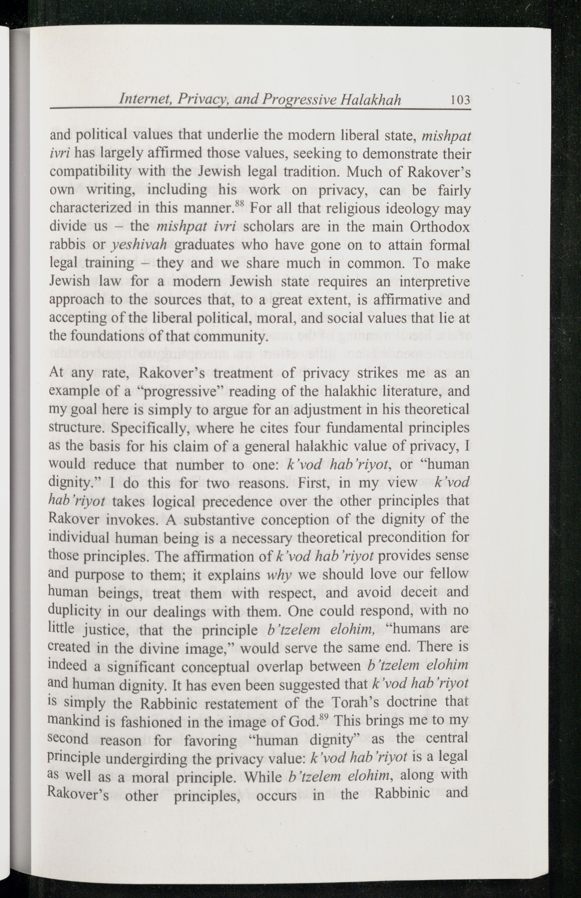 and political values that underlie the modern liberal state, mishpat ivri has largely affirmed those values, seeking to demonstrate their compatibility with the Jewish legal tradition. Much of Rakover’s own writing, including his work on privacy, can be fairly characterized in this manner.*® For all that religious ideology may divide us— the mishpat ivri scholars are in the main Orthodox rabbis or yeshivah graduates who have gone on to attain formal legal training— they and we share much in common. To make Jewish law for a modern Jewish state requires an interpretive approach to the sources that, to a great extent, is affirmative and accepting of the liberal political, moral, and social values that lie at the foundations of that community.