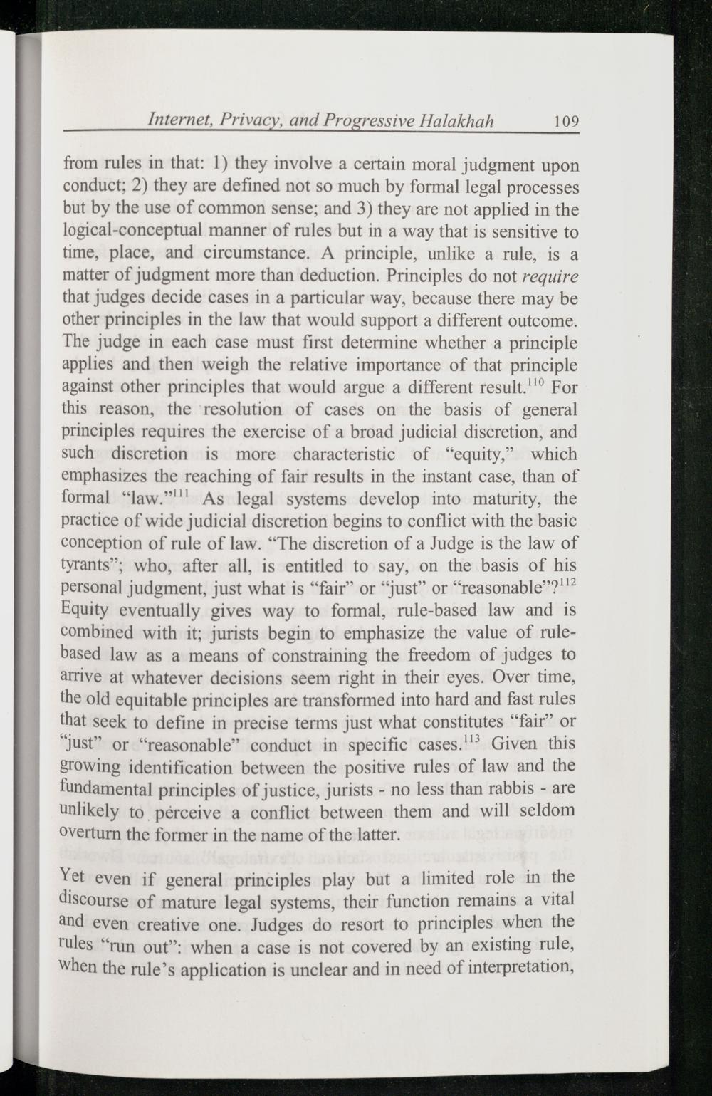 from rules in that: 1) they involve a certain moral judgment upon conduct; 2) they are defined not so much by formal legal processes but by the use of common sense; and 3) they are not applied in the logical-conceptual manner of rules but in a way that is sensitive to time, place, and circumstance. A principle, unlike a rule, is a matter of judgment more than deduction. Principles do not require that judges decide cases in a particular way, because there may be other principles in the law that would support a different outcome. The judge in each case must first determine whether a principle applies and then weigh the relative importance of that principle against other principles that would argue a different result.’ For this reason, the resolution of cases on the basis of general principles requires the exercise of a broad judicial discretion, and such discretion is more characteristic of“equity,” which emphasizes the reaching of fair results in the instant case, than of formal“law.”"'' As legal systems develop into maturity, the practice of wide judicial discretion begins to conflict with the basic conception of rule of law.“The discretion of a Judge is the law of tyrants”; who, after all, is entitled to say, on the basis of his personal judgment, just what is“fair” or“just” or“reasonable”?'"? Equity eventually gives way to formal, rule-based law and is combined with it; jurists begin to emphasize the value of rulebased law as a means of constraining the freedom of judges to arrive at whatever decisions seem right in their eyes. Over time, the old equitable principles are transformed into hard and fast rules that seek to define in precise terms just what constitutes“fair” or “Just” or“reasonable” conduct in specific cases.'"’ Given this growing identification between the positive rules of law and the fundamental principles of justice, jurists- no less than rabbis- are unlikely to pérceive a conflict between them and will seldom overturn the former in the name of the latter.