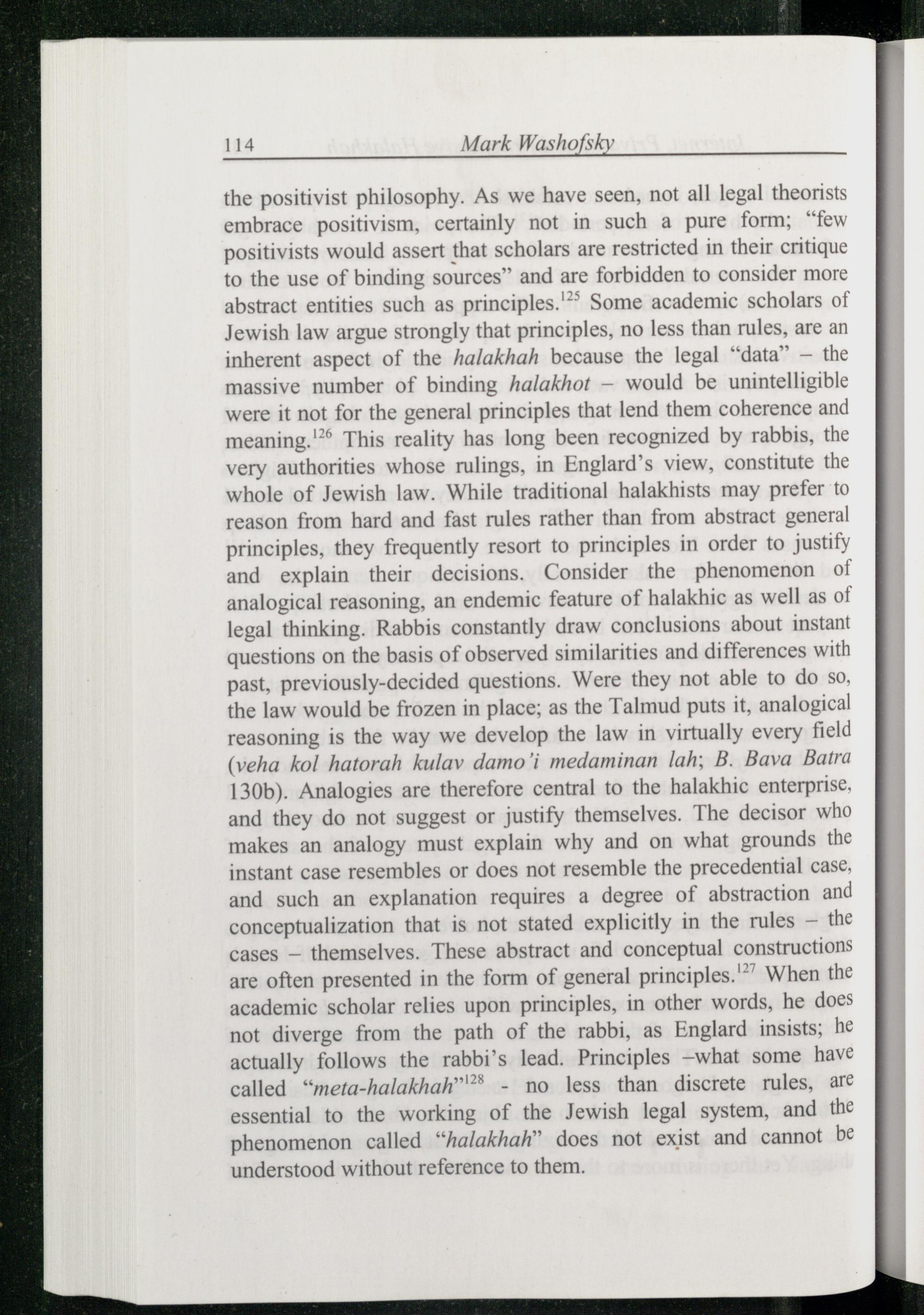 the positivist philosophy. As we have seen, not all legal theorists embrace positivism, certainly not in such a pure form;“few positivists would assert that scholars are restricted in their critique to the use of binding sources” and are forbidden to consider more abstract entities such as principles.” Some academic scholars of Jewish law argue strongly that principles, no less than rules, are an inherent aspect of the halakhah because the legal“data”— the massive number of binding halakhot— would be unintelligible were it not for the general principles that lend them coherence and meaning.'”® This reality has long been recognized by rabbis, the very authorities whose rulings, in Englard’s view, constitute the whole of Jewish law. While traditional halakhists may prefer to reason from hard and fast rules rather than from abstract general principles, they frequently resort to principles in order to justify and explain their decisions. Consider the phenomenon of analogical reasoning, an endemic feature of halakhic as well as of legal thinking. Rabbis constantly draw conclusions about instant questions on the basis of observed similarities and differences with past, previously-decided questions. Were they not able to do so, the law would be frozen in place; as the Talmud puts it, analogical reasoning is the way we develop the law in virtually every field (veha kol hatorah kulav damo’i medaminan lah; B. Bava Batra 130b). Analogies are therefore central to the halakhic enterprise, and they do not suggest or justify themselves. The decisor who makes an analogy must explain why and on what grounds the instant case resembles or does not resemble the precedential case, and such an explanation requires a degree of abstraction and conceptualization that is not stated explicitly in the rules— the cases— themselves. These abstract and conceptual constructions are often presented in the form of general principles.” When the academic scholar relies upon principles, in other words, he does not diverge from the path of the rabbi, as Englard insists; he actually follows the rabbi’s lead. Principles—what some have called“meta-halakhah™®®- no less than discrete rules, arc essential to the working of the Jewish legal system, and the phenomenon called“halakhah” does not exist and cannot be understood without reference to them.