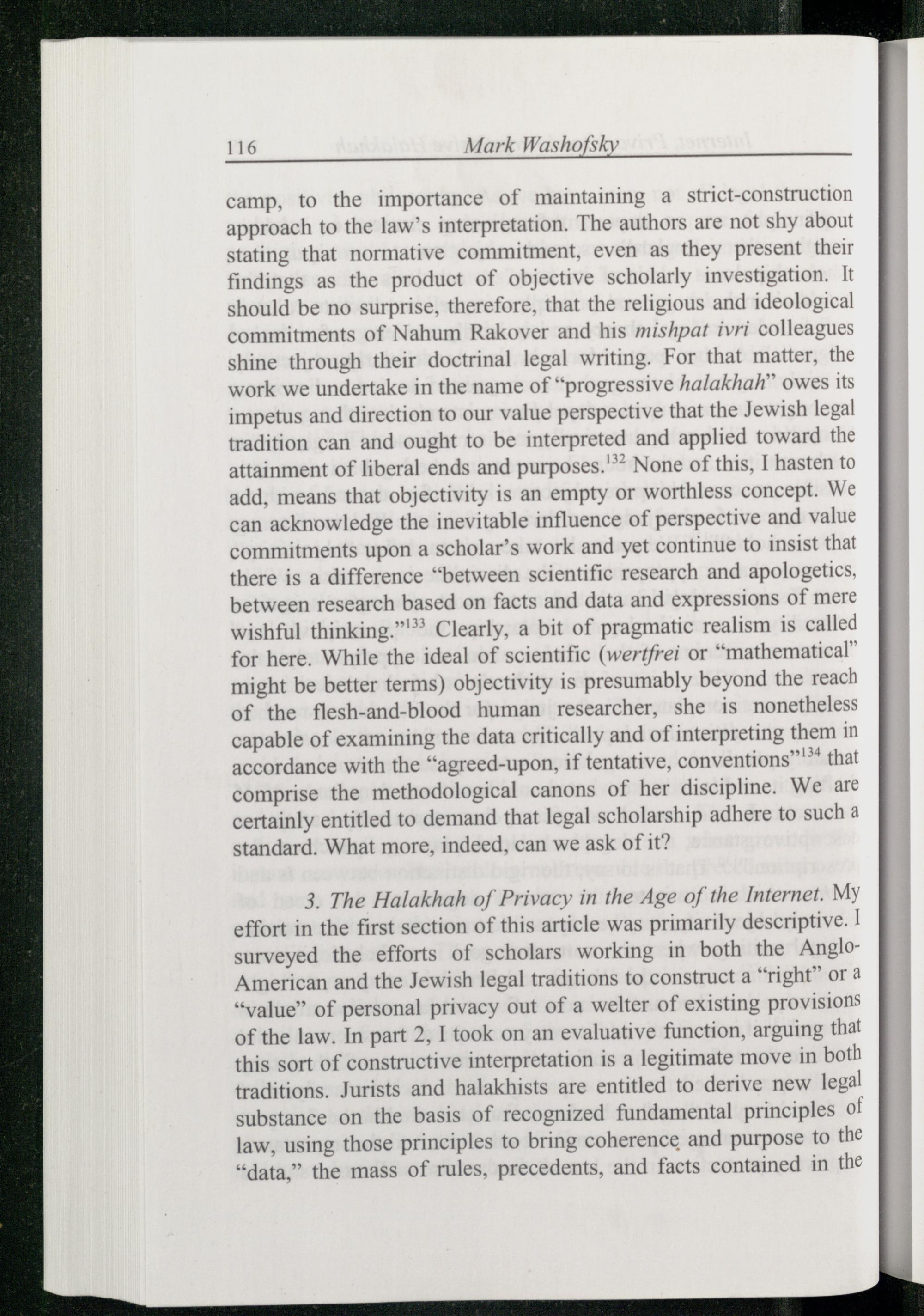 camp, to the importance of maintaining a strict-construction approach to the law’s interpretation. The authors are not shy about stating that normative commitment, even as they present their findings as the product of objective scholarly investigation. It should be no surprise, therefore, that the religious and ideological commitments of Nahum Rakover and his mishpat ivri colleagues shine through their doctrinal legal writing. For that matter, the work we undertake in the name of“progressive halakhah™ owes its impetus and direction to our value perspective that the Jewish legal tradition can and ought to be interpreted and applied toward the attainment of liberal ends and purposes.'*” None of this, I hasten to add, means that objectivity is an empty or worthless concept. We can acknowledge the inevitable influence of perspective and value commitments upon a scholar’s work and yet continue to insist that there is a difference“between scientific research and apologetics, between research based on facts and data and expressions of mere wishful thinking.”'* Clearly, a bit of pragmatic realism is called for here. While the ideal of scientific(wertfrei or“mathematical”