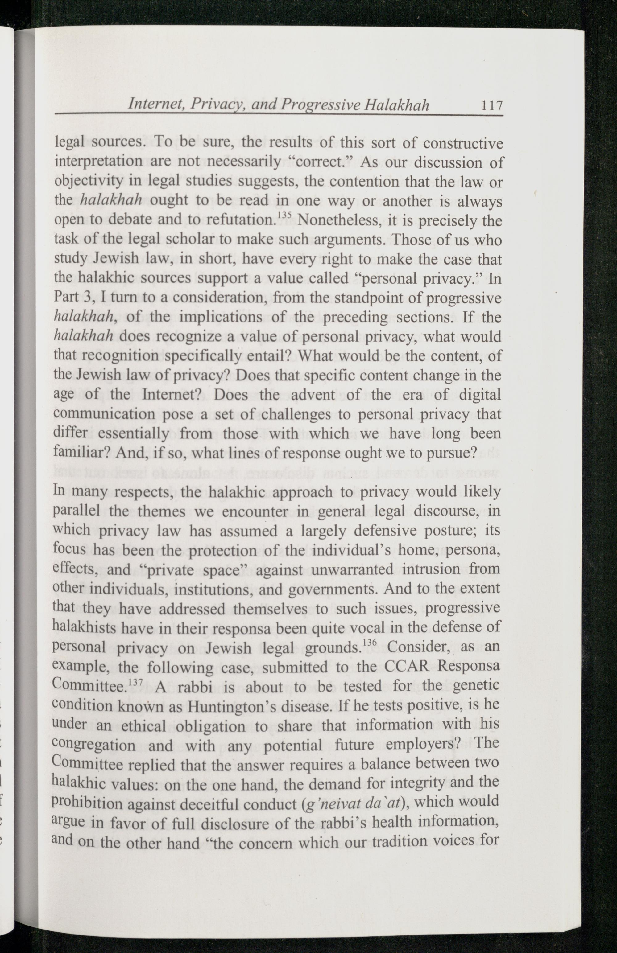 In many respects, the halakhic approach to privacy would likely parallel the themes we encounter in general legal discourse, in which privacy law has assumed a largely defensive posture; its focus has been the protection of the individual’s home, persona, effects, and“private space” against unwarranted intrusion from other individuals, institutions, and governments. And to the extent that they have addressed themselves to such issues, progressive halakhists have in their responsa been quite vocal in the defense of personal privacy on Jewish legal grounds.” Consider, as an example, the following case, submitted to the CCAR Responsa Committee.” A rabbi is about to be tested for the genetic condition known as Huntington’s disease. If he tests positive, is he under an ethical obligation to share that information with his congregation and with any potential future employers? The Committee replied that the answer requires a balance between two halakhic values: on the one hand, the demand for integrity and the Prohibition against deceitful conduct(g neivat da at), which would argue in favor of full disclosure of the rabbi’s health information, and on the other hand“the concern which our tradition voices for