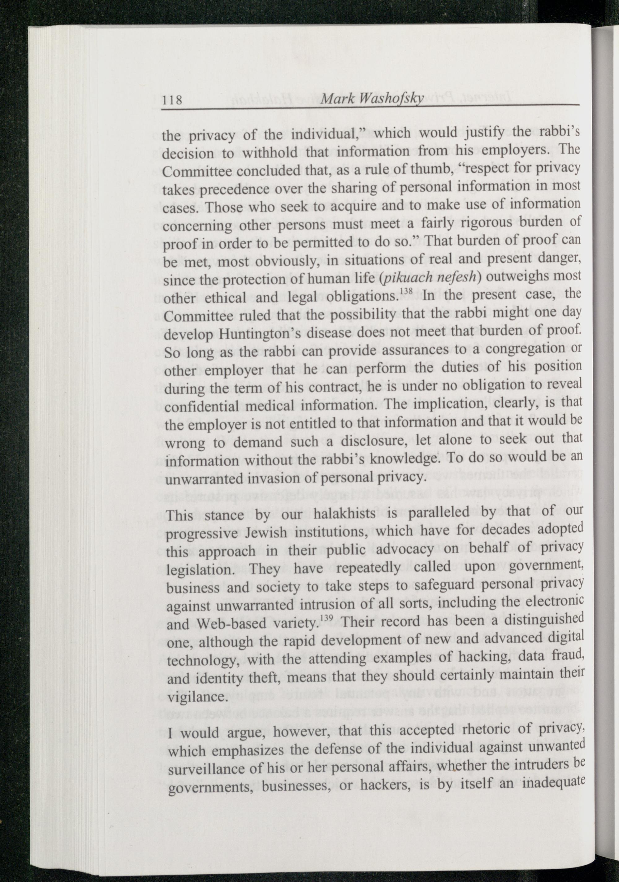 the privacy of the individual,” which would justify the rabbi’s decision to withhold that information from his employers. The Committee concluded that, as a rule of thumb,“respect for privacy takes precedence over the sharing of personal information in most cases. Those who seek to acquire and to make use of information concerning other persons must meet a fairly rigorous burden of proof in order to be permitted to do so.” That burden of proof can be met, most obviously, in situations of real and present danger, since the protection of human life(pikuach nefesh) outweighs most other ethical and legal obligations." In the present case, the Committee ruled that the possibility that the rabbi might one day develop Huntington’s disease does not meet that burden of proof. So long as the rabbi can provide assurances to a congregation or other employer that he can perform the duties of his position during the term of his contract, he is under no obligation to reveal confidential medical information. The implication, clearly, is that the employer is not entitled to that information and that it would be wrong to demand such a disclosure, let alone to seek out that information without the rabbi’s knowledge. To do so would be an unwarranted invasion of personal privacy.