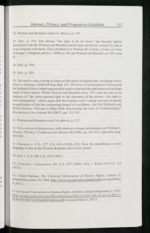 31. Warren and Brandeis (note 16, above), p. 213. 32. Fora survey of this process, with citations of cases and statutes, see William L. Prosser ,“Privacy, ” California Law Review 48(1960), pp. 383-423, especially at pp.