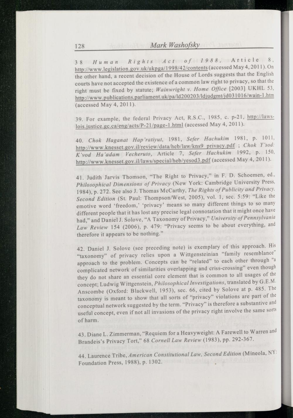 41. Judith Jarvis Thomson ,“The Right to Privacy,” in F. D. Schoemen, ed. Philosophical Dimensions of Privacy (New York : Cambridge University Press , 1984), p. 272. See also J. Thomas McCarthy , The Rights of Publicity and Privacy , Second Edition(St. Paul: Thompson/West, 2005), vol. 1, sec. 5:59:“Like the emotive word‘freedom,’‘privacy’ means so many different things to so many different people that it has lost any precise legal connotation that it might once have had.” and Daniel J. Solove ,“A Taxonomy of Privacy,” University of Pennsylvania Law Review 154(2006), p. 479:“Privacy seems to be about everything, and